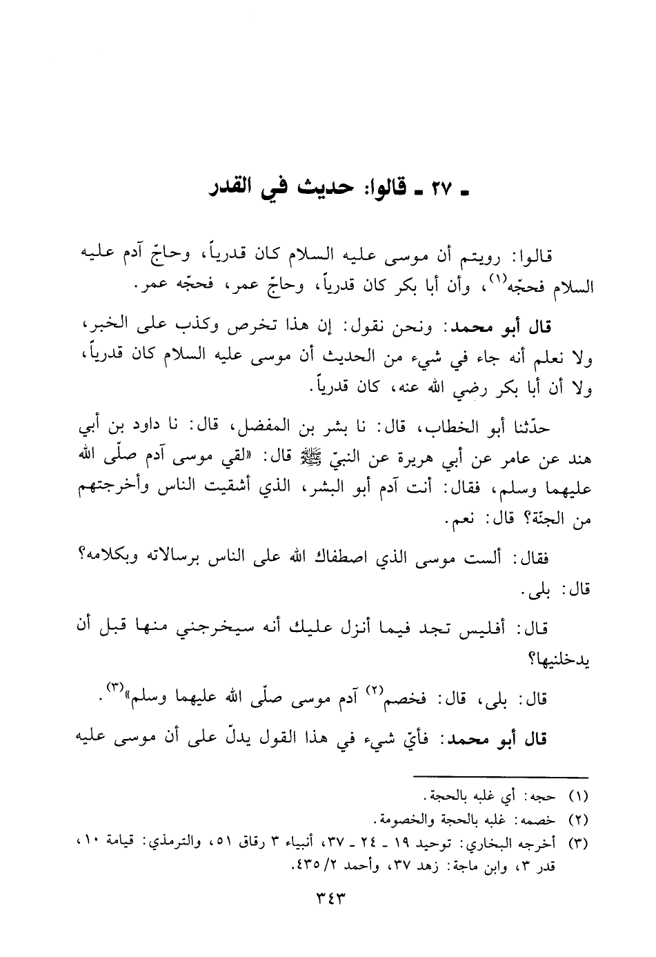 حَدَّثَنَا أَبُو الْخَطَّابِ، قَالَ: حَدَّثَنَا بِشْرُ بْنُ الْمُفَضَّلِ، قَالَ: حَدَّثَنَا دَاوُدُ بْنُ أَبِي هِنْدٍ عَنِ عَامِرٍ عَنْ أَبِي هُرَيْرَةَ عَنِ النَّبِيَّ صَلَّى اللَّهُ عَلَيْهِ وَسَلَّمَ قَالَ: "لَقِيَ مُوسَى آدَمَ صَلَّى اللَّهُ عَلَيْهِمَا وَسَلَّمَ، فَقَالَ: أَنْتَ آدَمُ أَبُو الْبَشَرِ، الَّذِي أَشْقَيْتَ النَّاسَ وَأَخْرَجْتَهُمْ مِنَ الْجَنَّةِ؟ قَالَ: نَعَمْ، فَقَالَ: أَلَسْتَ مُوسَى الَّذِي اصْطَفَاكَ اللَّهُ عَلَى النَّاسِ بِرِسَالَاتِهِ وَبِكَلَامِهِ؟ قَالَ: بَلَى، قَالَ: أَفَلَيِسَ تَجِدُ فِيمَا أُنْزِلَ عَلَيْكَ أَنَّهُ سَيُخْرِجُنِي مِنْهَا قَبْلَ أَنْ يُدْخِلَنِيهَا؟ قَالَ: بلَى، قَالَ فَخص م 2 آدَمُ مُوسَى صَلَّى اللَّهُ عَلَيْهِمَا وَسَلَّمَ" 3.