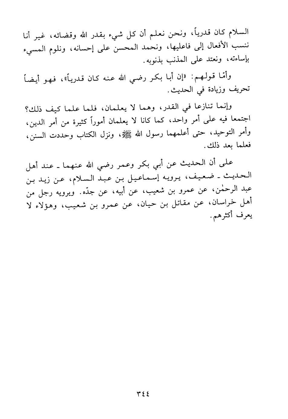 السَّلَام كَانَ قَدَرِيًّا، وَنَحْنُ نَعْلَمُ أَنَّ كُلَّ شَيْءٍ بِقَدَرِ اللَّهِ وَقَضَائِهِ، غَيْرَ أَنَّا نَنْسُبُ الْأَفْعَالَ إِلَى فَاعِلِيهَا، وَنَحْمَدُ الْمُحْسِنَ عَلَى إِحْسَانِهِ، وَنَلُومُ الْمُسِيءَ بِإِسَاءَتِهِ، وَنَعْتَدُّ عَلَى الْمُذْنِبِ بِذُنُوبِهِ.