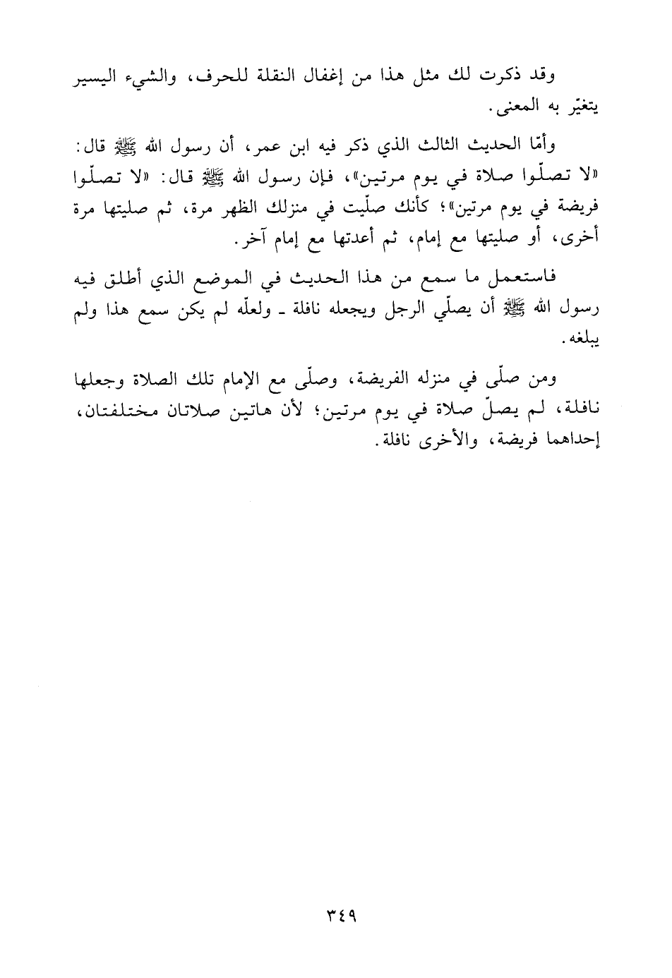 وَأَمَّا الْحَدِيثُ الثَّالِثُ الَّذِي ذَكَرَ فِيهِ ابْنُ عُمَرَ، أَنَّ رَسُولَ اللَّهِ صَلَّى اللَّهُ عَلَيْهِ وَسَلَّمَ قَالَ: "لَا تُصَلُّوا صَلَاةً فِي يَوْمٍ مَرَّتَيْنِ"؛ فَإِنَّ رَسُولَ اللَّهِ صَلَّى اللَّهُ عَلَيْهِ وَسَلَّمَ قَالَ: "لَا تُصَلُّوا فَرِيضَةً فِي يَوْمٍ مَرَّتَيْنِ"؛ كَأَنَّكَ صَلَّيْتَ فِي مَنْزِلِكَ الظُّهْرَ مَرَّةً، ثُمَّ صَلَّيْتَهَا مَرَّةً أُخْرَى، أَوْ صَلَّيْتَهَا مَعَ إِمَامٍ، ثُمَّ أَعَدْتَهَا مَعَ إِمَامٍ آخَرَ.