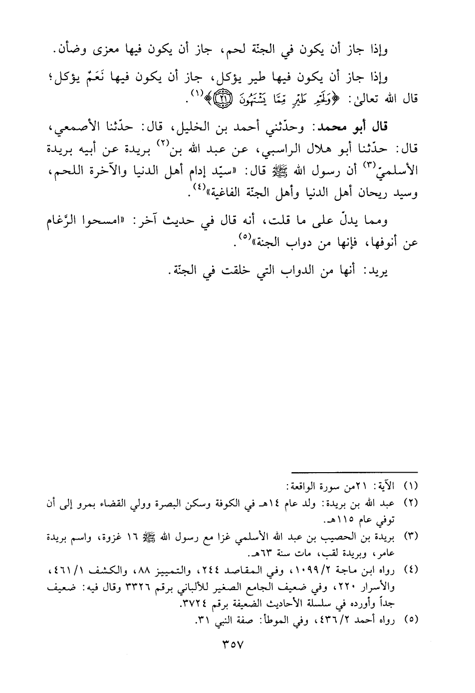 حَدثنِي أَحْمَدُ بْنُ الْخَلِيلِ، قَالَ: حَدَّثَنَا الْأَصْمَعِيُّ، قَالَ: حَدَّثَنَا أَبُو هِلَالٍ الرَّاسِبِيُّ، عَنْ عَبْدِ اللَّهِ بْنِ2 بُرَيْدَةَ عَنْ أَبِيهِ بُرَيْدَةَ الْأَسْلَمِيِّ3 إِنَّ رَسُولَ اللَّهِ صَلَّى اللَّهُ عَلَيْهِ وَسَلَّمَ قَالَ: "سَيِّدُ إِدَامِ أَهْلِ الدُّنْيَا وَالْآخِرَةِ اللَّحْمُ، وَسَيِّدُ رَيْحَانِ أَهْلِ الدُّنْيَا وَأَهْلِ الْجَنَّةِ الْفَاغِيَةُ"4.