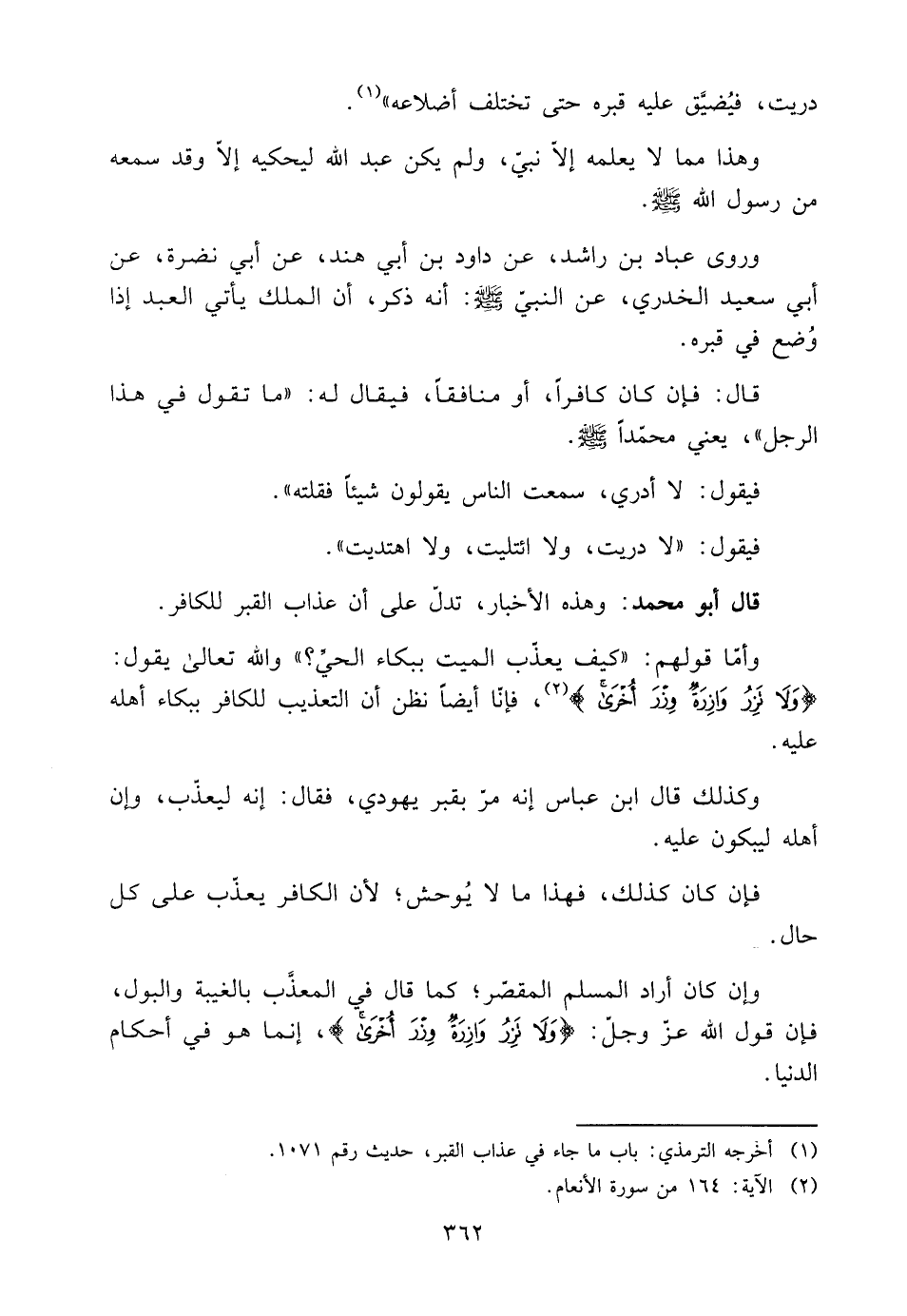 1 أخرجه التِّرْمِذِيّ: بَاب مَا جَاءَ فِي عَذَاب الْقَبْر، حَدِيث رقم 1071.