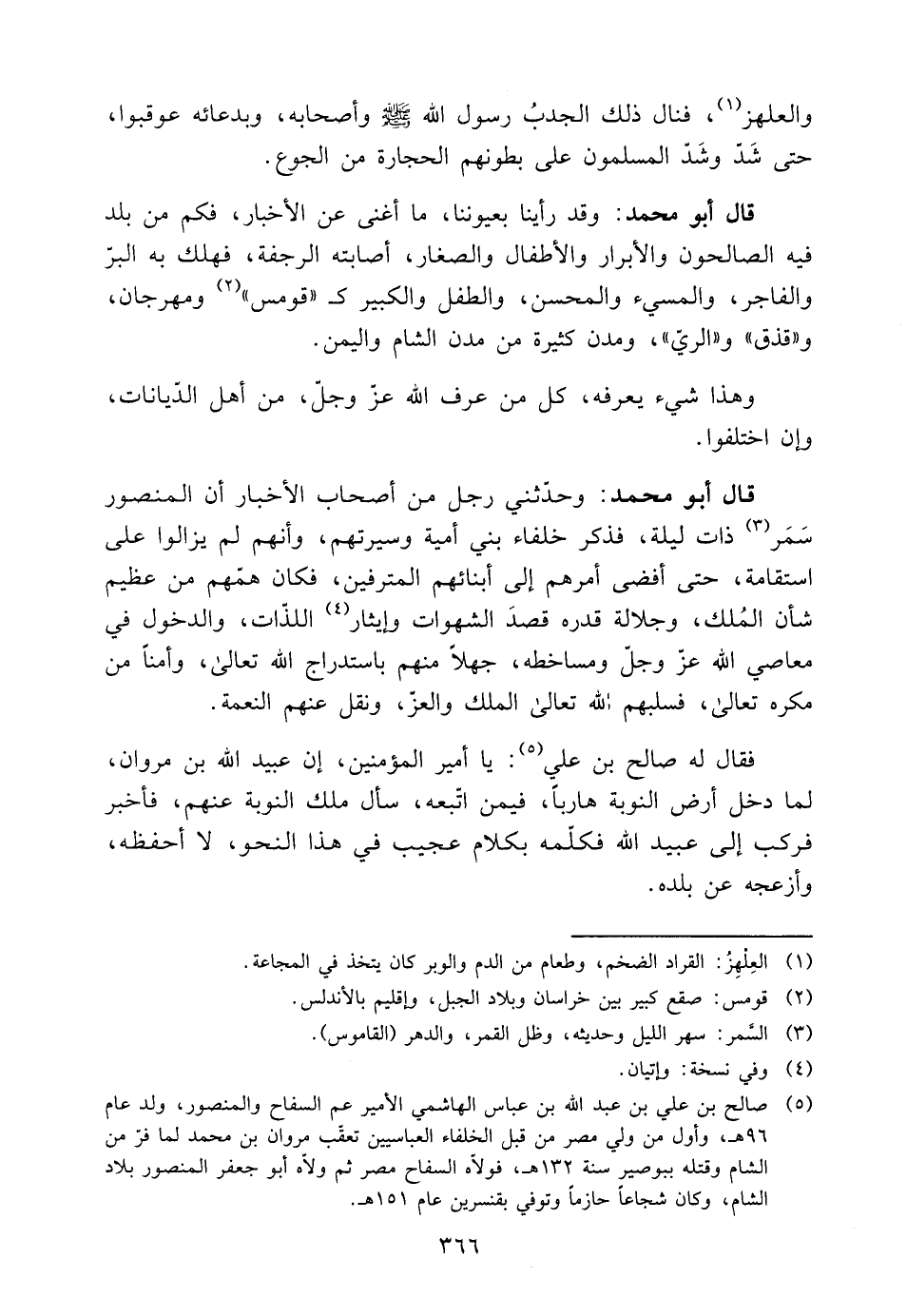 وَحَدَّثَنِي رَجُلٌ مِنْ أَصْحَابِ الْأَخْبَارِ أَنَّ الْمَنْصُورَ سَمَرَ3 ذَاتَ لَيْلَةٍ، فَذَكَرَ خُلَفَاءَ بَنِي أُمَيَّةَ وَسِيرَتَهُمْ، وَأَنَّهُمْ لَمْ يَزَالُوا عَلَى اسْتِقَامَةٍ، حَتَّى أَفْضَى أَمْرُهُمْ إِلَى أَبْنَائِهِمُ الْمُتْرَفِينَ، فَكَانَ هَمُّهُمْ مِنْ عَظِيمِ شَأْنِ الْمُلْكِ، وَجَلَالَةِ قَدْرِهِ قَصْدَ الشَّهَوَاتِ وَإِيثَارَ4 اللَّذَّاتِ، وَالدُّخُولَ فِي مَعَاصِي اللَّهِ عَزَّ وَجَلَّ وَمَسَاخِطِهِ، جَهْلًا مِنْهُمْ بِاسْتِدْرَاجِ اللَّهِ تَعَالَى، وَأَمْنًا مِنْ مَكْرِهِ تَعَالَى، فَسَلَبَهُمُ اللَّهَ تَعَالَى الْمُلْكَ وَالْعِزَّ، وَنَقَلَ عَنْهُمُ النِّعْمَةَ.