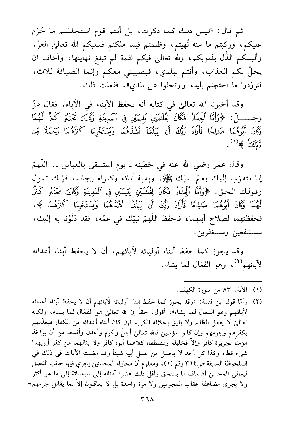 2 وَأما قَول ابْن قُتَيْبَة: "وَقَدْ يَجُوزُ كَمَا حَفِظَ أَبْنَاءَ أَوْلِيَائِهِ لِآبَائِهِمْ أَنْ لَا يَحْفَظَ أَبْنَاءَ أَعْدَائِهِ لِآبَائِهِمْ وَهُوَ الْفَعَّالُ لما يَشَاء"، أَقُول: حقًّا إِن الله تَعَالَى هُوَ الفعال لما يَشَاء، وَلكنه تَعَالَى لَا يفعل الظُّلم وَلَا يَلِيق بجلاله الْكَرِيم فَإِن كَانَ أَبنَاء أعدائه من الْكفَّار فيعذبهم بكفرهم وجرمهم وَإِن كَانُوا مُؤمنين فَالله تَعَالَى أجل وَأكْرم وَأَعْدل وأقسط من أنم يُؤَاخذ مُؤمنا بجريرة كَافِر وَإِلَّا فخليله ومصطفاه كِلَاهُمَا أَبوهُ كَافِر وَلَا ينالهما من كفر أبويهما شَيْء قطّ، وَكَذَا كل أحد لَا يحمل من عمل أَبِيه شَيْئا وَقد مَضَت الْآيَات فِي ذَلِك الملحوظة السَّابِقَة ص364 رقم "1"، وَمَعْلُوم أَن مجازاة الْمُحْسِنِينَ يجْرِي فِيهَا جَانب الْفضل فَيعْطى المحسن أَضْعَاف مَا يسْتَحق وَأَقل ذَلِك عشرَة أَمْثَاله إِلَى سَبْعمِائة إِلَى مَا هُوَ أَكثر وَلَا يجْرِي مضاعفة عِقَاب الْمُجْرمين وَلَا مرّة وَاحِدَة بل لَا يعاقبون إِلَّا بِمَا يُقَابل جرمهم =