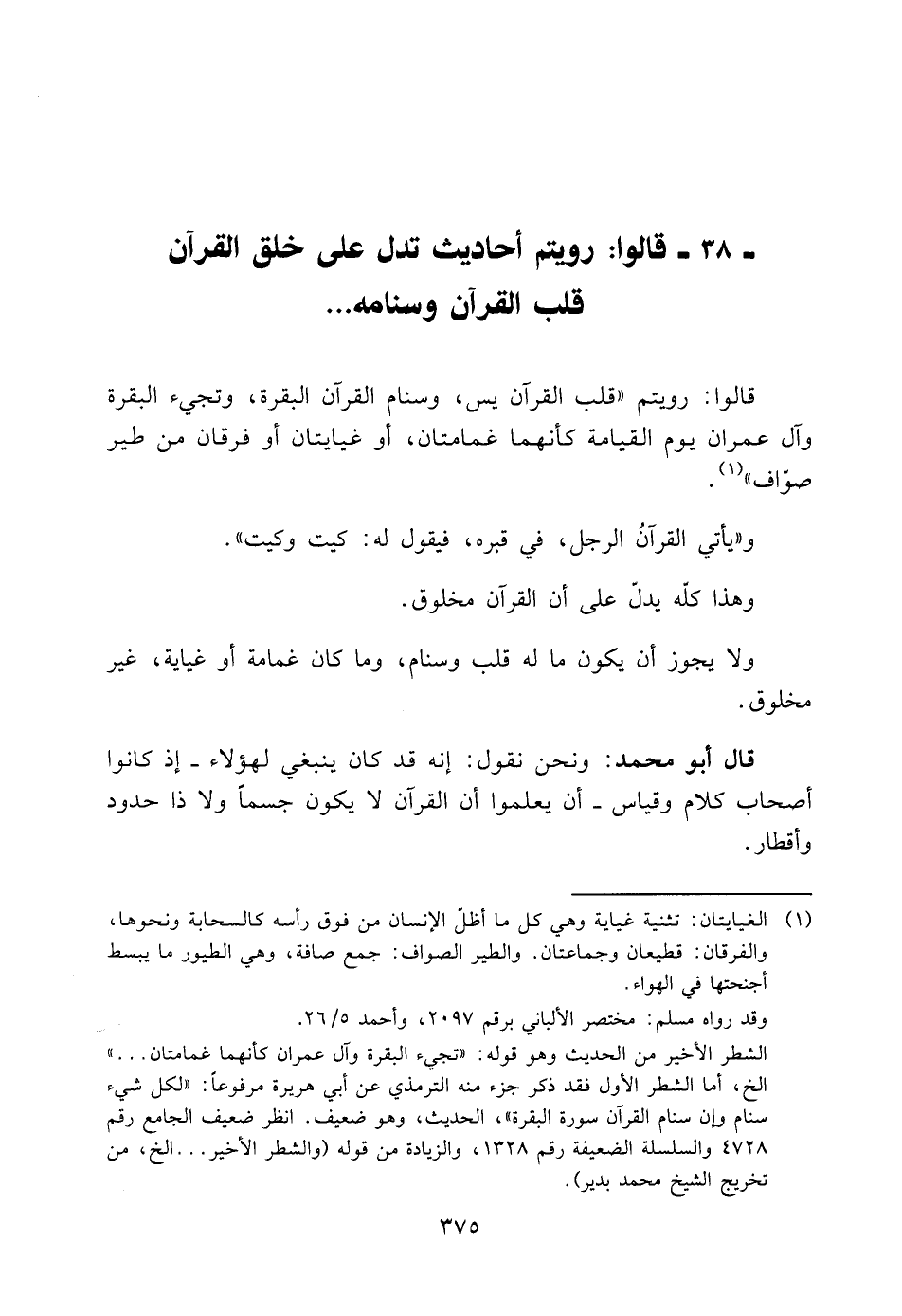 38- قَالُوا: أَحَادِيثُ تَدُلُّ عَلَى خَلْقِ الْقُرْآنِ- قَلْبُ الْقُرْآنِ وَسَنَامُهُ ... :