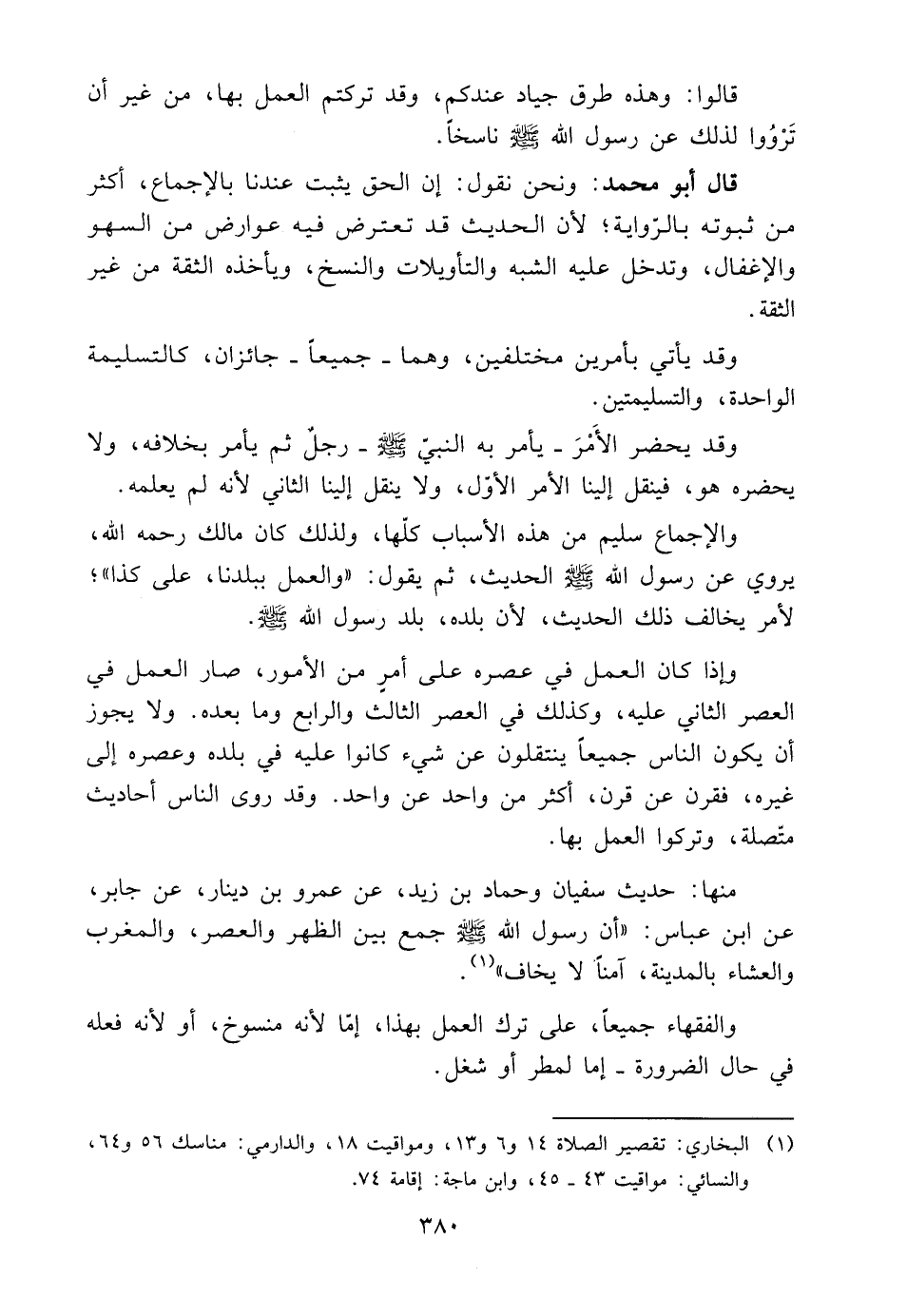 وَإِذَا كَانَ الْعَمَلُ فِي عَصْرِهِ عَلَى أَمْرٍ مِنَ الْأُمُورِ، صَارَ الْعَمَلُ فِي الْعَصْرِ الثَّانِي عَلَيْهِ، وَكَذَلِكَ فِي الْعَصْرِ الثَّالِثِ وَالرَّابِعِ وَمَا بَعْدَهُ. وَلَا يَجُوزُ أَنْ يَكُونَ النَّاسُ جَمِيعًا يَنْتَقِلُونَ عَنْ شَيْءٍ كَانُوا عَلَيْهِ فِي بَلَدِهِ وَعَصْرِهِ إِلَى غَيْرِهِ، فَقَرْنٌ عَنْ قَرْنٍ، أَكْثَرُ مِنْ وَاحِدٍ عَنْ وَاحِدٍ. وَقَدْ رَوَى النَّاسُ أَحَادِيثَ مُتَّصِلَةً، وَتَرَكُوا الْعَمَلَ بِهَا.
