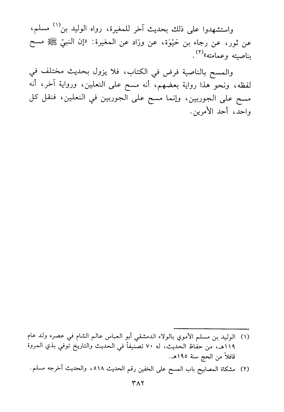 وَاسْتَشْهَدُوا عَلَى ذَلِكَ بِحَدِيثٍ آخَرَ لِلْمُغِيرَةِ، رَوَاهُ الْوَلِيدُ بْنُ1 مُسْلِمٍ، عَنْ ثَوْرٍ، عَنْ رَجَاءِ بْنِ حَيْوَةَ، عَنْ وَرَّادٍ عَنِ الْمُغِيرَةِ، أَنَّ النَّبِيَّ صَلَّى اللَّهُ عَلَيْهِ وَسَلَّمَ مَسَحَ بِنَاصِيَتِهِ وَعِمَامَتِهِ"2.