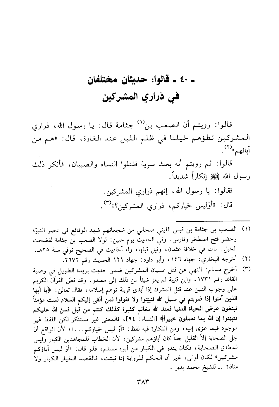 3 أخرجه مُسلم: النَّهْي عَن قتل صبيانمك الْمُشْركين ضمنك حَدِيث بُرَيْدَة الطَّوِيل فِي وَصِيَّة الْقَائِد رقم 1731، وَابْن قُتَيْبَة لم يعز شَيْئا من ذَلِك إِلَى مصدر. وَقد نَص الْقُرْآن الْكَرِيم على وجوب التبين عِنْد قتل الْمُشرك إِذا أبدى قرينَة توهم إِسْلَامه، فَقَالَ تَعَالَى: {يَا أَيُّهَا الَّذِينَ آمَنُوا إِذَا ضَرَبْتُمْ فِي سَبِيلِ اللَّهِ فَتَبَيَّنُوا وَلا تَقُولُوا لِمَنْ أَلْقَى إِلَيْكُمُ السَّلامَ لَسْتَ مُؤْمِنًا تَبْتَغُونَ عَرَضَ الْحَيَاةِ الدُّنْيَا فَعِنْدَ اللَّهِ مَغَانِمُ كَثِيرَةٌ كَذَلِكَ كُنْتُمْ مِنْ قَبْلُ فَمَنَّ اللَّهُ عَلَيْكُمْ فَتَبَيَّنُوا إِنَّ اللَّهَ كَانَ بِمَا تَعْمَلُونَ خَبِيرًا} [النِّسَاء: 94] ، فَالْمَعْنى غير مستنكر لَكِن اللَّفْظ غير مَوْجُود فِيمَا عزى إِلَيْهِ، وَمن النكارة فِيهِ لفظ: "أَو لَيْسَ خياركم.."؛ لِأَن الْوَاقِع أَن جلّ الصَّحَابَة إِلَّا الْقَلِيل جدا كَانَ آباؤهم مُشْرِكين، لِأَن الْخطاب للمجاهدين الْكِبَار وَلَيْسَ لمُطلق الصَّحَابَة، فَكَانَ ينْدر فِي الْكِبَار من أَبوهُ مُسلم، فَلَو قَالَ: "أَو لَيْسَ آباؤكم مُشْرِكين" لَكَانَ أولى، غير أَن الحكم للرواية إِذا ثبتَتْ، فالقصد الْخِيَار الْكِبَار وَلَا مُنَافَاة. -للشَّيْخ مُحَمَّد بدير-