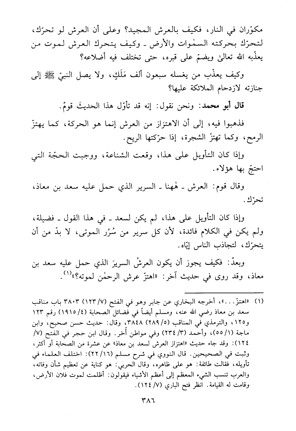 مكوران فِي النَّارِ، فَكَيْفَ بِالْعَرْشِ الْمَجِيدِ؟ وَعَلَى أَنَّ الْعَرْشَ لَوْ تَحَرَّكَ، لَتَحَرَّكَ بِحَرَكَتِهِ السَّمَاوَاتُ وَالْأَرْضُ -وَكَيْفَ يَتَحَرَّكُ الْعَرْشُ لِمَوْتِ مَنْ يُعَذِّبُهُ اللَّهُ تَعَالَى وَيَضُمُّ عَلَيْهِ قَبْرَهُ، حَتَّى تَخْتَلِفَ فِيهِ أَضْلَاعُهُ؟