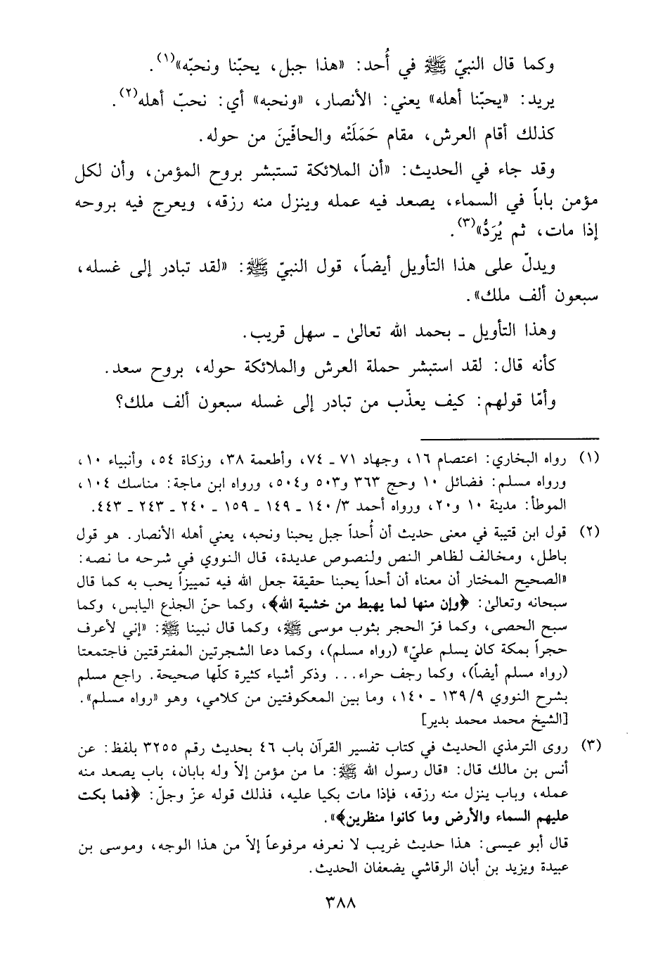 2 قَول ابْن قُتَيْبَة فِي معنى حَدِيث أَن أحدا جبل يحبنا ونحبه، يَعْنِي أَهله الْأَنْصَار. هُوَ قَول بَاطِل، ومخالف لظَاهِر النَّص ولنصوص عديدة، قَالَ النَّوَوِيّ فِي شَرحه مَا نَصه: "الصَّحِيح الْمُخْتَار أَن مَعْنَاهُ أَن أحدا يحبنا حَقِيقَة جعل الله فِيهِ تمييزًا يحب بِهِ كَمَا قَالَ سُبْحَانَهُ وَتَعَالَى: {وَإِنَّ مِنْهَا لَمَا يَهْبِطُ مِنْ خَشْيَةِ اللَّهِ} ، وكما حن الْجذع الْيَابِس، وكما سبح الْحَصَى، وكما فر الْحجر يثوب مُوسَى صَلَّى اللَّهُ عَلَيْهِ وَسَلَّمَ، وكما قَالَ نَبِيُّنَا صَلَّى اللَّهُ عَلَيْهِ وَسَلَّمَ: "إِنِّي لأعرف حجرا بِمَكَّة كَانَ يسلم عَليّ" "رَوَاهُ مُسلم"، وكما دَعَا الشجرتين المفترقتين فَاجْتَمَعْنَا "رَوَاهُ مُسلم أَيْضا"، وكما رجف حراء ... وَذكر أَشْيَاء كَثِيرَة كلهَا صَحِيحَة. رَاجع مُسلم بشرح النَّوَوِيّ 9/ 139-140، وَمَا بَين المعكوفتين من كَلَامي، وَهُوَ "رَوَاهُ مُسلم". "الشَّيْخ مُحَمَّد مُحَمَّد بدير".