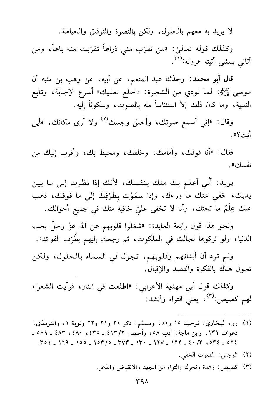 وَحدثنَا عَن عَبْدُ الْمُنْعِمِ، عَنْ أَبِيهِ، عَنْ وَهْبِ بْنِ مُنَبِّهٍ أَنَّ مُوسَى صَلَّى اللَّهُ عَلَيْهِ وَسَلَّمَ: لَمَّا نُودِيَ مِنَ الشَّجَرَةِ: "اخْلَعْ نَعْلَيْكَ" أَسْرَعَ الْإِجَابَةَ، وَتَابَعَ التَّلْبِيَةَ، وَمَا كَانَ ذَلِكَ إِلَّا اسْتِئْنَاسًا مِنْهُ بِالصَّوْتِ، وَسُكُونًا إِلَيْهِ.