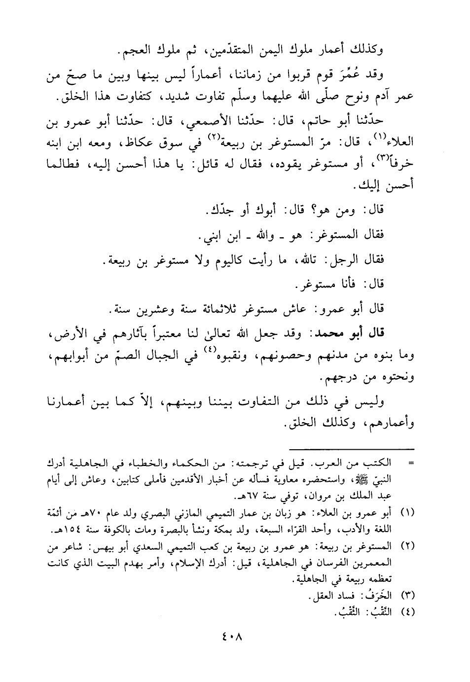 وَقَدْ عُمِّرَ قَوْمٌ قَرَبُوا مِنْ زَمَانِنَا، أَعْمَارًا لَيْسَ بَيْنَهَا وَبَيْنَ مَا صَحَّ مِنْ عُمُرِ آدَمَ وَنُوحٍ صَلَّى اللَّهُ عَلَيْهِمَا وَسَلَّمَ تَفَاوُتٌ شَدِيدٌ، كَتَفَاوُتِ هَذَا الْخَلْقِ.