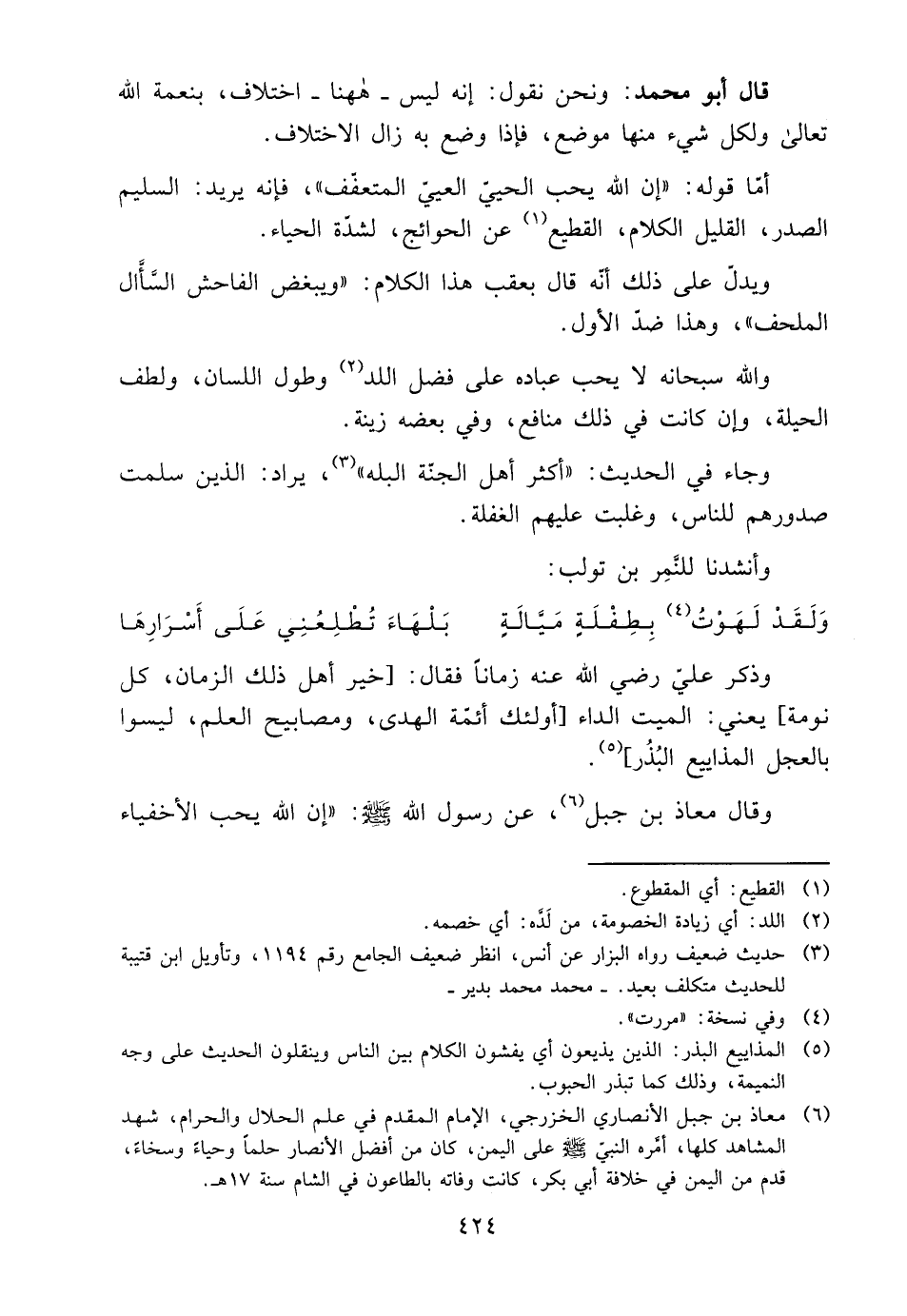 أَمَّا قَوْلُهُ: "إِنَّ اللَّهَ يُحِبُّ الْحَيِيَّ الْعَيِيَّ الْمُتَعَفِّفَ"، فَإِنَّهُ يُرِيدُ: السَّلِيمَ الصَّدْرِ، الْقَلِيلَ الْكَلَامِ، الْقَطِيعَ1 عَنِ الْحَوَائِجِ، لِشِدَّةِ الْحَيَاءِ.