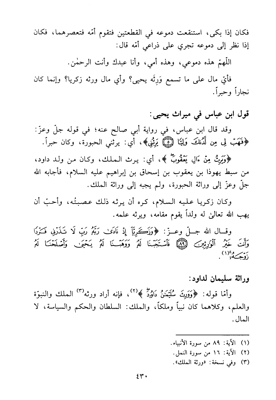 وَأَمَّا قَوْلُهُ: {وَوَرِثَ سُلَيْمَانُ دَاوُدَ} 5، فَإِنَّهُ أَرَادَ وِرْثَهُ3 الْمُلْكَ وَالنُّبُوَّةَ وَالْعِلْمَ، وَكِلَاهُمَا كَانَ نَبِيًّا وَمَلِكًا، وَالْمُلْكُ: السُّلْطَانُ وَالْحُكْمُ وَالسِّيَاسَةُ، لَا المَال.