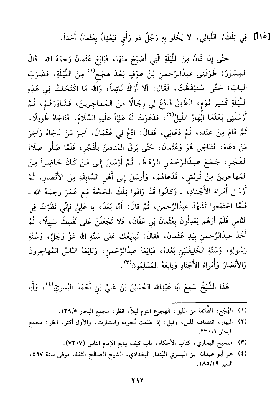 حَتَّى إِذَا كَانَ مِنَ اللَّيْلَةِ الَّتِي أَصْبَحَ مِنْهَا، فَبَايَعَ عُثْمَانَ رَحِمَهُ اللَّهُ. قَالَ الْمِسْوُرَ: طَرَقَنِي عَبْدُ الرَّحْمَنِ بْنُ عوفٍ بَعْدَ هجعٍ مِنَ اللَّيْلَةِ، فَضَرَبَ الْبَابَ؛ حَتَّى اسْتَيْقَظْتُ، فَقَالَ: أَلا أَرَاكَ نَائِمًا، وَاللَّهِ مَا اكْتَحَلْتُ فِي هَذِهِ اللَّيْلَةِ كَثِيرَ نومٍ، انْطَلِقْ فَادْعُ لِي رِجَالا مِنَ الْمُهَاجِرِينَ، فَشَاوِرْهُمْ، ثُمَّ أَرْسِلْنِي بَعْدمَا ابْهَارَّ اللَّيْلُ، فَدَعَوْتُ لَهُ عَلِيًّا عَلَيْهِ السَّلامُ، فَنَاجَاهُ طَوِيلا، ثُمَّ قَامَ مِنْ عِنْدِهِ، ثُمَّ دَعَانِي، فَقَالَ: ادْعُ لِي عُثْمَانَ، آخِرُ مَنْ نَاجَاهُ وَآخِرُ مَنْ دَعَاهُ، فَتَنَاجَى هُوَ وَعُثْمَانُ، حَتَّى بَرِقَ الْمُنَادِينَ لِلْفَجْرِ، فَلَمَّا صَلَّوْا صَلاةَ الْفَجْرِ، جَمَعَ عَبْدُ الرَّحْمَنِ الرَّهْطَ، ثُمَّ أَرْسَلَ إِلَى مَنْ كَانَ حَاضِرًا مِنَ الْمُهَاجِرِينَ مِنْ قريشٍ، فَدَعَاهُمْ، وَأَرْسَلَ إِلَى أَهْلِ السَّابِقَةِ مِنَ الأَنْصَارِ، ثُمَّ أَرْسَلَ أُمَرَاءَ الأَجْنَادِ، -وَكَانُوا قَدْ وَافَوْا تِلْكَ الْحَجَّةَ مَعَ عُمَرَ رَحِمَهُ اللَّهُ- فَلَمَّا اجْتَمَعُوا تَشَهَّدَ عَبْدُ الرَّحْمَنِ، ثُمَّ قَالَ: أَمَّا بَعْدُ، يَا عَلِيُّ فَإِنِّي نَظَرْتُ فِي النَّاسِ فَلَمْ أَرَهُمْ يَعْدِلُونَ بِعُثْمَانَ بْنِ عَفَّانَ، فَلا تجَعَلَنَّ عَلَى نَفْسِكَ سَبِيلا، ثُمَّ أَخَذَ عَبْدُ الرَّحْمَنِ بِيَدِ عُثمَانَ، فَقَالَ: نُبَايِعُكَ عَلَى سُنَّةِ اللَّهِ عَزَّ وَجَلَّ، وَسُنَّةِ رَسُولِهِ، وَسُنَّةِ الْخَلِيفَتَيْنِ بَعْدَهُ، فَبَايَعَهُ عَبْدُ الرَّحْمَنِ، وَبَايَعَهُ النَّاسُ الْمُهَاجِرُونَ وَالأَنْصَارُ وَأُمَرَاءُ الأَجْنَادِ وَبَايَعَهُ الْمُسْلِمُونَ.