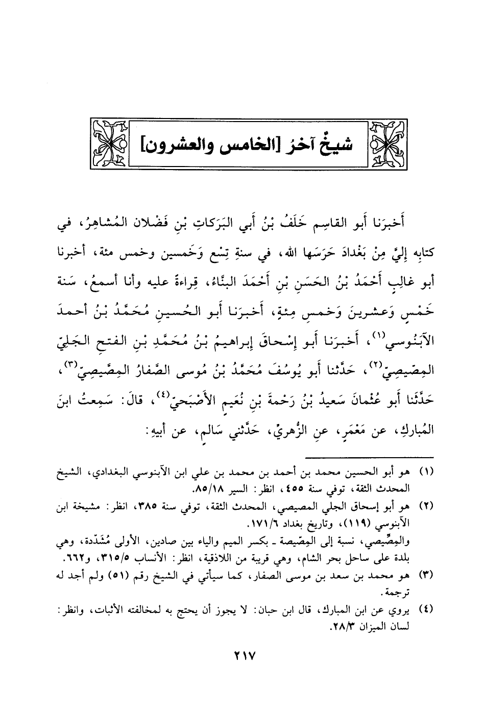 أَخْبَرَنَا أَبُو الْقَاسِمِ خَلَفُ بْنُ أَبِي الْبَرَكَاتِ بْنِ فَضْلانَ الْمُشَاهِرُ، فِي كِتَابِهِ إِلَيَّ مِنْ بَغْدَادَ حَرَسَهَا اللَّهُ، في سنة تسع وخمسين وخمس مئة، أَخْبَرَنَا أَبُو غالبٍ أَحْمَدُ بْنُ الْحَسَنِ بْنِ أَحْمَدَ الْبَنَّاءُ، قِرَاءَةً عَلَيْهِ وَأَنَا أَسْمَعُ، سَنَةَ خمسٍ وعشرين وخمس مئةٍ، أَخْبَرَنَا أَبُو الْحُسَيْنِ مُحَمَّدُ بْنُ أَحْمَدَ الآبَنُوسِيُّ، أَخْبَرَنَا أَبُو إِسْحَاقَ إِبْرَاهِيمُ بْنُ مُحَمَّدِ بْنِ الْفَتْحِ الْجَلِيُّ الْمِصِّيصِيُّ، حَدَّثَنَا أَبُو يُوسُفَ مُحَمَّدُ بْنُ مُوسَى الصَّفَّارُ الْمِصِّيصِيُّ، حَدَّثَنَا أَبُو عُثْمَانَ سَعِيدُ بْنُ رَحْمَةَ بْنِ نعيمٍ الأَصْبَحِيُّ، قَالَ: سَمِعْتُ ابْنَ الْمُبَارَكِ، عَنْ مَعْمَرٍ، عَنِ الزُّهْرِيِّ، حَدَّثَنِي سالمٍ، عَنْ أَبِيهِ: