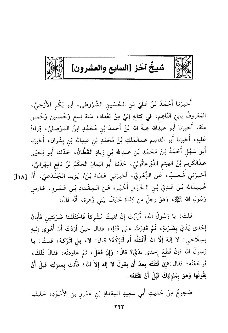 أَخْبَرَنَا أَحْمَدُ بْنُ عَلِيِّ بْنِ الْحُسَيْنِ الشُّرُوطِيُّ، أَبُو بَكْرٍ الأَزَجِيُّ، الْمَعْرُوفُ بِابْنِ النَّاعِمِ، فِي كِتَابِهِ إِلَيَّ مِنْ بغداد، سنة تسع وخمسين وخمس مئة، أَخْبَرَنَا أَبُو عَبْدِ اللَّهِ هِبَةُ اللَّهِ بْنُ أحمد بن محمد ابن الْمَوْصِلِيِّ، قِرَاءَةً عَلَيْهِ، أَخْبَرَنَا أَبُو الْقَاسِمِ عَبْدُ الْمَلِكِ بْنُ مُحَمَّدِ بْنِ عَبْدِ اللَّهِ بْنِ بِشْرَانَ، أَخْبَرَنَا أَبُو سَهْلٍ أَحْمَدُ بْنُ مُحَمَّدِ بْنِ عَبْدِ اللَّهِ بْنِ زِيَادٍ الْقَطَّانُ، حَدَّثَنَا أَبُو يَحْيَى عَبْدُ الْكَرِيمِ بْنُ الْهَيْثَمِ الدَّيْرَعَاقُولِيُّ، حَدَّثَنَا أَبُو الْيَمَانِ الْحَكَمُ بْنُ نَافِعٍ الْبَهْرَانِيُّ، أَخْبَرَنِي شعيبٌ، عَنِ الزُّهْرِيِّ، أَخْبَرَنِي عَطَاءُ بْنُ يزيد الجندعي، أن عبيد الله بْنَ عَدِيِّ بْنِ الْخَيَّارِ أَخْبَرَهُ عَنِ الْمِقْدَادِ بْنِ عمروٍ، فَارِسِ رَسُولِ اللَّهِ صَلَّى اللَّهُ عَلَيْهِ وَسَلَّمَ، وَهُوَ رجلٌ مِنْ كِنْدَةَ حليفٌ لِبَنِي زُهْرَةَ، أَنَّهُ قَالَ: