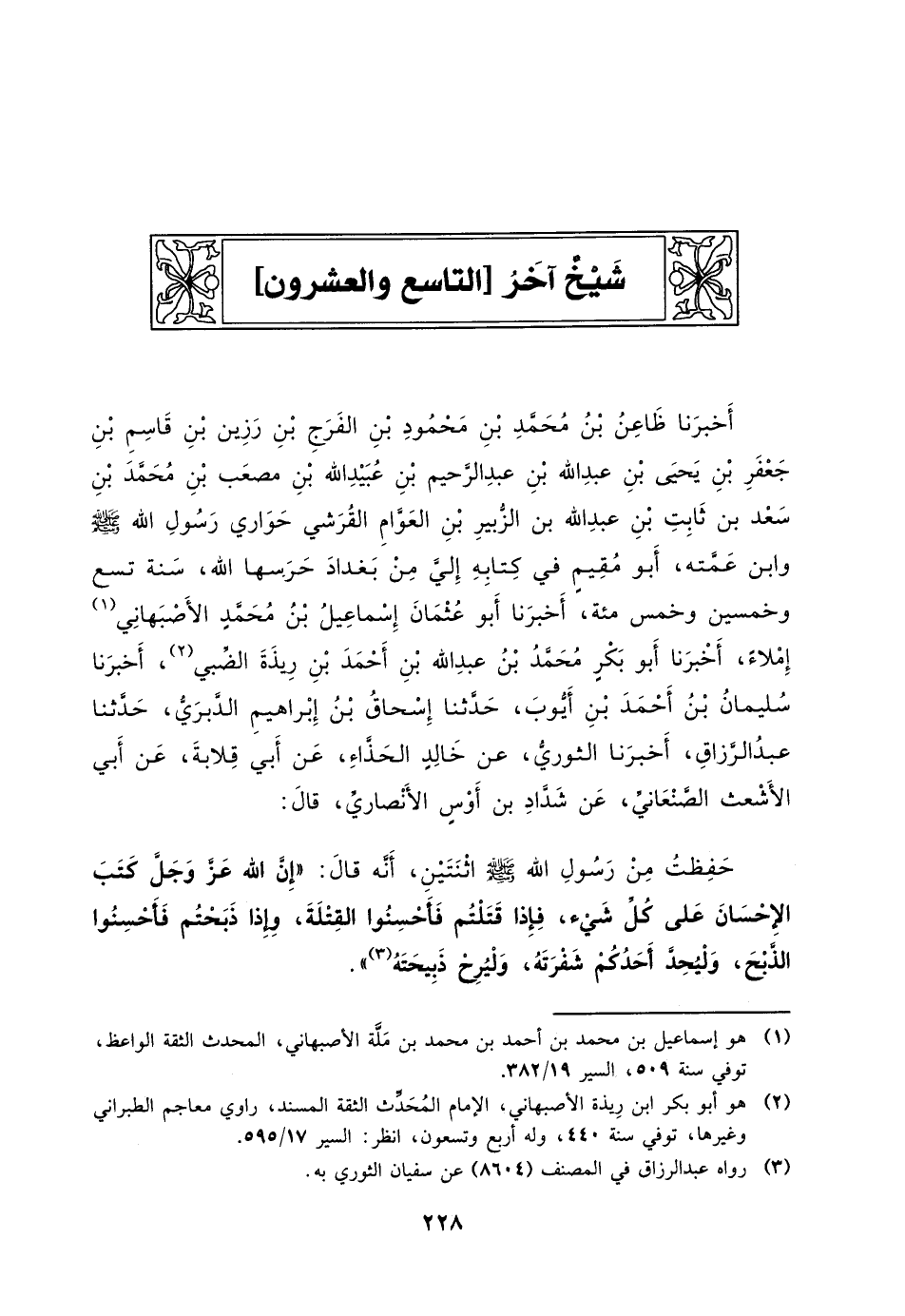 أَخْبَرَنَا ظَاعِنُ بْنُ مُحَمَّدِ بْنِ مَحْمُودِ بْنِ الْفَرَجِ بْنِ رَزِينِ بْنِ قَاسِمِ بْنِ جَعْفَرِ بْنِ يَحْيَى بْنِ عبد الله بن عبد الرحيم بن عبيد الله بْنِ مُصْعَبِ بْنِ مُحَمَّدِ بْنِ سَعْدِ بْنِ ثَابِتِ بْنِ عَبْدِ اللَّهِ بْنِ الزُّبَيْرِ بْنِ الْعَوَّامِ الْقُرَشِيُّ حَوَارِيُّ رَسُولِ اللَّهِ صَلَّى اللَّهُ عَلَيْهِ وَسَلَّمَ وَابْنُ عَمَّتِهِ، أَبُو مقيمٍ فِي كِتَابِهِ إِلَيَّ مِنْ بَغْدَادَ حَرَسَهَا اللَّهُ، سَنَةَ تسع وخمسين وخمس مئة، أَخْبَرَنَا أَبُو عُثْمَانَ إِسْمَاعِيلُ بْنُ محمدٍ الأَصْبَهَانِيُّ إِمْلاءً، أَخْبَرَنَا أَبُو بكرٍ مُحَمَّدُ بْنُ عَبْدِ اللَّهِ بْنِ أَحْمَدَ بْنِ رِيذَةَ الضَّبِّيُّ، أَخْبَرَنَا سُلَيْمَانُ بْنُ أَحْمَدَ بْنِ أَيُّوبَ، حَدَّثَنَا إِسْحَاقُ بْنُ إِبْرَاهِيمَ الدَّبَرِيُّ، حَدَّثَنَا عَبْدُ الرَّزَّاقِ، أَخْبَرَنَا الثَّوْرِيُّ، عَنْ خالدٍ الْحَذَّاءِ، عَنْ أَبِي قِلابَةَ، عَنْ أَبِي الأَشْعَثِ الصَّنْعَانِيِّ، عَنْ شَدَّادِ بْنِ أوسٍ الأَنْصَارِيِّ، قَالَ: