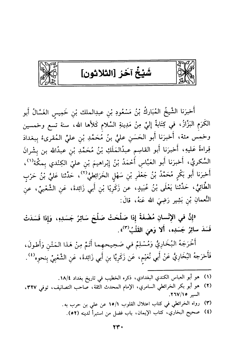 أَخْبَرَنَا الشَّيْخُ الْمُبَارَكُ بْنُ مسعود بن عبد الملك بن خميسٍ الْغَسَّالُ أَبُو الْكَرْمِ الْبَزَّازُ، فِي كِتَابِهِ إِلَيَّ مِنْ مَدِينَةِ السَّلامِ كَلأَهَا اللَّهُ، سَنَةَ تِسْعٍ وخمسين وخمس مئة، أَخْبَرَنَا أَبُو الْحَسَنِ عَلِيُّ بْنُ مُحَمَّدِ بْنِ عَلِيٍّ الْمُقْرِئُ بِبَغْدَادَ قِرَاءَةً عَلَيْهِ، أَخْبَرَنَا أَبُو الْقَاسِمِ عَبْدُ الْمَلِكِ بْنُ مُحَمَّدِ بْنِ عَبْدِ اللَّهِ بْنِ بِشْرَانَ السُّكَّرِيُّ، أَخْبَرَنَا أَبُو الْعَبَّاسِ أَحْمَدُ بْنُ إِبْرَاهِيمَ بْنِ عَلِيٍّ الْكِنْدِيُّ بِمَكَّةَ، أَخْبَرَنَا أَبُو بَكْرٍ مُحَمَّدُ بْنُ جَعْفَرِ بْنِ سَهْلٍ الْخَرَائِطِيُّ، حَدَّثَنَا عَلِيُّ بْنُ حربٍ الطَّائِيُّ، حَدَّثَنَا يَعْلَى بْنُ عبيدٍ، عَنْ زَكَرِيَّا بْنِ أَبِي زَائِدَةَ، عَنِ الشَّعْبِيِّ، عَنِ النُّعْمَانِ بْنِ بَشِيرٍ رَضِيَ اللَّهُ عَنْهُ، قَالَ: