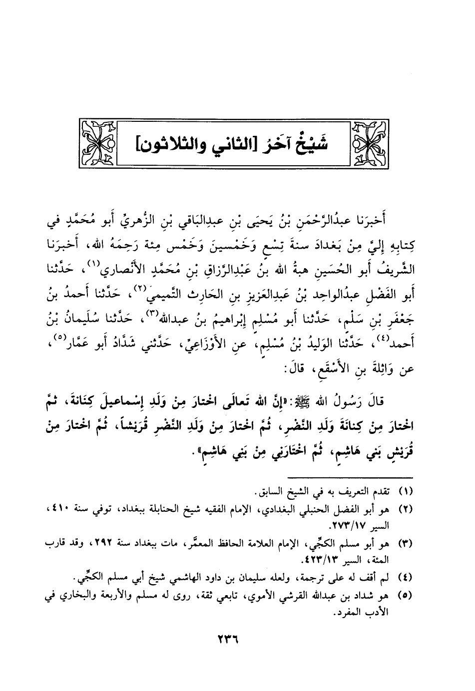 أَخْبَرَنَا عَبْدُ الرَّحْمَنِ بْنُ يَحْيَى بْنِ عَبْدِ الْبَاقِي بْنِ الزُّهْرِيِّ أَبُو محمدٍ فِي كِتَابِهِ إِلَيَّ مِنْ بَغْدَادَ سنة تسعٍ وخمسين وخمس مئة رَحِمَهُ اللَّهُ، أَخْبَرَنَا الشَّرِيفُ أَبُو الْحُسَيْنِ هِبَةُ اللَّهِ بْنُ عَبْدِ الرَّزَّاقِ بْنِ محمدٍ الأَنْصَارِيُّ، حَدَّثَنَا أَبُو الْفَضْلِ عَبْدُ الْوَاحِدِ بْنُ عَبْدِ الْعَزِيزِ بْنِ الْحَارِثِ التَّمِيمِيُّ، حَدَّثَنَا أَحْمَدُ بْنُ جَعْفَرِ بْنِ سلمٍ، حَدَّثَنَا أَبُو مسلمٍ إِبْرَاهِيمُ بْنُ عَبْدِ اللَّهِ، حَدَّثَنَا سُلَيْمَانُ بْنُ أَحْمَدَ، حَدَّثَنَا الْوَلِيدُ بْنُ مسلمٍ، عَنِ الأَوْزَاعِيِّ، حَدَّثَنِي شَدَّادٌ أَبُو عَمَّارٍ، عَنْ وَاثِلَةَ بْنِ الأَسْقَعِ، قَالَ: