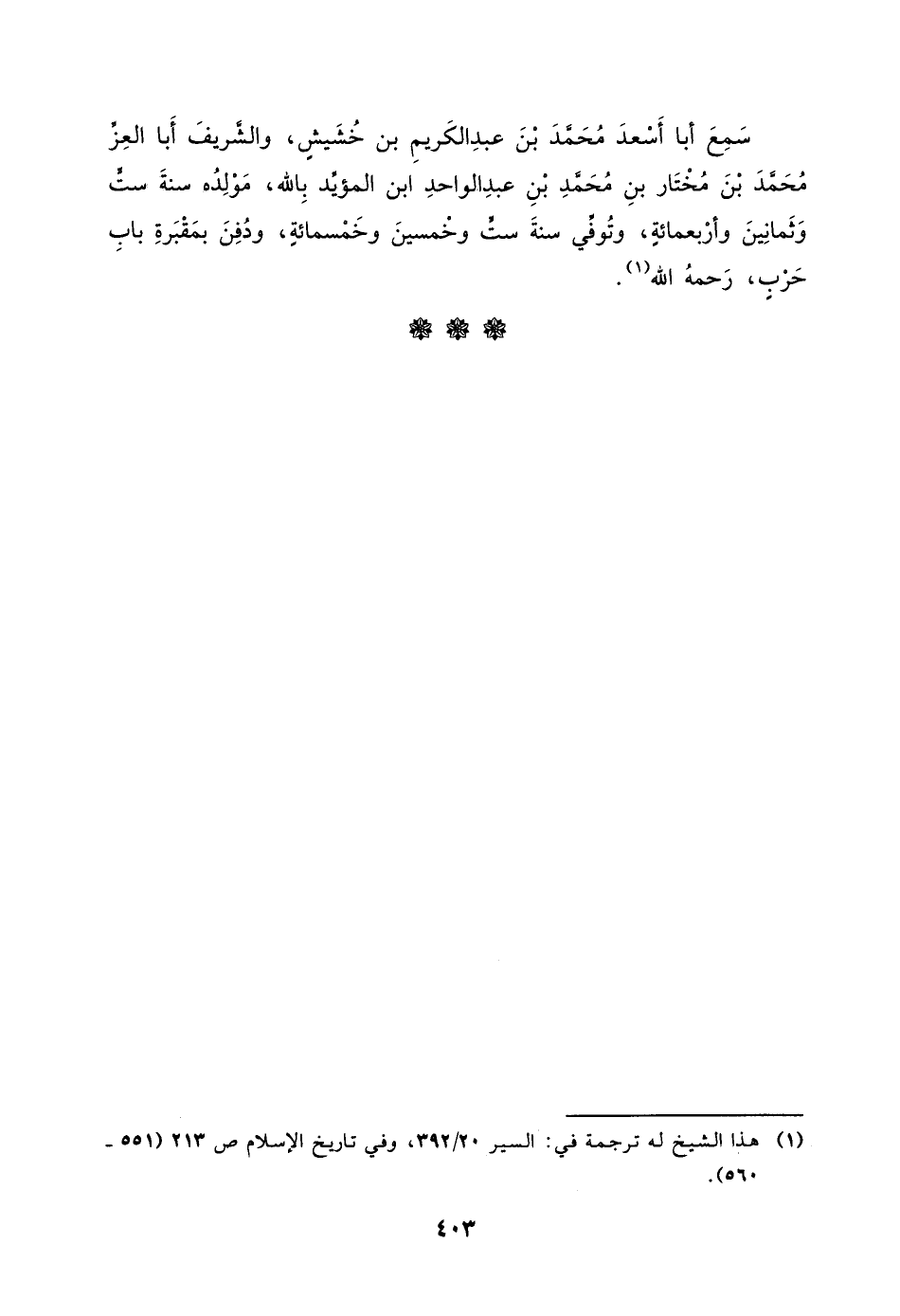 سَمِعَ أَبَا أَسْعَدَ مُحَمَّدَ بْنَ عَبْدِ الْكَرِيمِ بْنِ خُشَيْشٍ، وَالشَّرِيفَ أَبَا الْعِزِّ مُحَمَّدَ بْنَ مختار بن محمد بن عبد الواحد ابن المؤيد بالله، مولده سنة ست وثمانين وأربعمائة، وتوفي سنة ست وخمسين وخمسمائة، وَدُفِنَ بِمَقْبَرَةِ بَابِ حربٍ، رَحِمَهُ اللَّهُ.