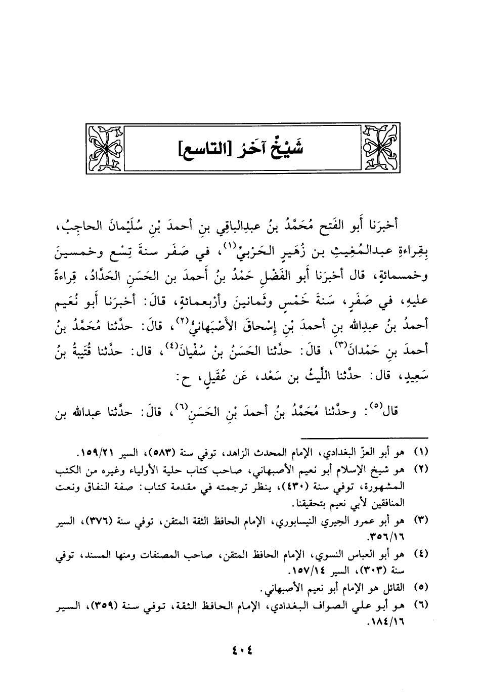 أَخْبَرَنَا أَبُو الْفَتْحِ مُحَمَّدُ بْنُ عَبْدِ الْبَاقِي بْنِ أَحْمَدَ بْنِ سُلَيْمَانَ الْحَاجِبُ، بِقِرَاءَةِ عَبْدِ الْمُغِيثِ بْنِ زُهَيْرٍ الْحَرْبِيِّ، في صفر سنة تسع وخمسين وخمسمائةٍ، قَالَ أَخْبَرَنَا أَبُو الْفَضْلِ حَمْدُ بْنُ أَحْمَدَ بْنِ الْحَسَنِ الْحَدَّادُ، قِرَاءَةً عَلَيْهِ، فِي صفرٍ، سنة خمسٍ وثمانين وأربعمائةٍ، قَالَ: أَخْبَرَنَا أَبُو نُعَيْمٍ أَحْمَدُ بْنُ عَبْدِ اللَّهِ بْنِ أَحْمَدَ بْنِ إِسْحَاقَ الأَصْبَهَانِيُّ، قَالَ: حَدَّثَنَا مُحَمَّدُ بْنُ أَحْمَدَ بْنِ حَمْدَانَ، قَالَ: حَدَّثَنَا الْحَسَنُ بْنُ سُفْيَانَ، قَالَ: حَدَّثَنَا قُتَيْبَةُ بْنُ سعيدٍ، قَالَ: حَدَّثَنَا اللَّيْثُ بْنُ سَعْدٍ، عَنْ عقيلٍ، ح: