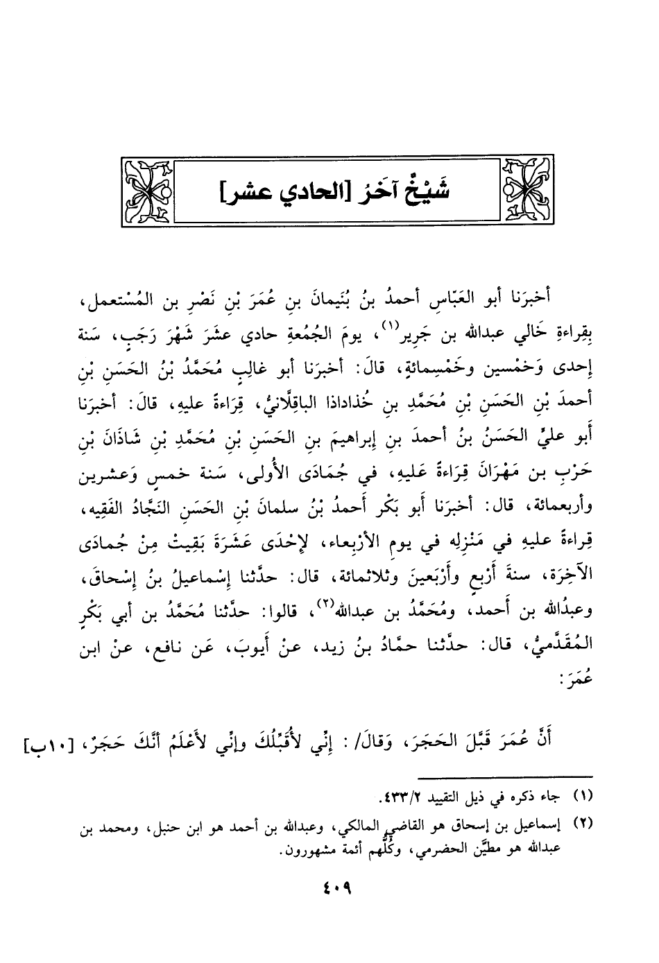 أَخْبَرَنَا أَبُو الْعَبَّاسِ أَحْمَدُ بْنُ بُنَيْمَانَ بْنِ عُمَرَ بْنِ نَصْرِ بْنِ الْمُسْتَعْمَلِ، بِقِرَاءَةِ خَالِي عَبْدِ اللَّهِ بْنِ جَرِيرٍ، يَوْمَ الْجُمُعَةِ حَادِي عَشَرَ شَهْرِ رجبٍ، سنة إحدى وخمسين وخمسمائة، قَالَ: أَخْبَرَنَا أَبُو غَالِبٍ مُحَمَّدُ بْنُ الْحَسَنِ بْنُ أَحْمَدَ بْنِ الْحَسَنِ بْنِ مُحَمَّدِ بْنِ خذاداذا الْبَاقِلانِيُّ، قِرَاءَةً عَلَيْهِ، قَالَ: أَخْبَرَنَا أَبُو عَلِيٍّ الْحَسَنُ بْنُ أَحْمَدَ بْنِ إِبْرَاهِيمَ بْنِ الْحَسَنِ بْنِ مُحَمَّدِ بْنِ شَاذَانَ بْنِ حَرْبِ بْنِ مِهْرَانَ قِرَاءَةً عَلَيْهِ، فِي جُمَادَى الأُولَى، سنة خمسٍ وعشرين وأربعمائة، قَالَ: أَخْبَرَنَا أَبُو بَكْرٍ أَحْمَدُ بْنُ سَلْمَانَ بْنِ الْحَسَنِ النَّجَّادُ الْفَقِيهُ، قِرَاءَةً عَلَيْهِ فِي مَنْزِلِهِ فِي يَوْمِ الأَرْبَعَاءِ، لإِحْدَى عَشْرَةَ بَقِيَتْ من جمادى الآخرة، سنة أربعٍ وأربعين وثلاثمائة، قَالَ: حَدَّثَنَا إِسْمَاعِيلُ بْنُ إِسْحَاقَ، وَعَبْدُ اللَّهِ بْنُ أَحْمَدَ، وَمُحَمَّدُ بْنُ عَبْدِ اللَّهِ، قَالُوا: حَدَّثَنَا مُحَمَّدُ بْنُ أَبِي بكرٍ الْمُقَدِّمِيُّ، قَالَ: حَدَّثَنَا حَمَّادُ بْنُ زَيْدٍ، عَنْ أَيُّوبَ، عَنْ نَافِعٍ، عَنِ ابْنِ عُمَرَ: