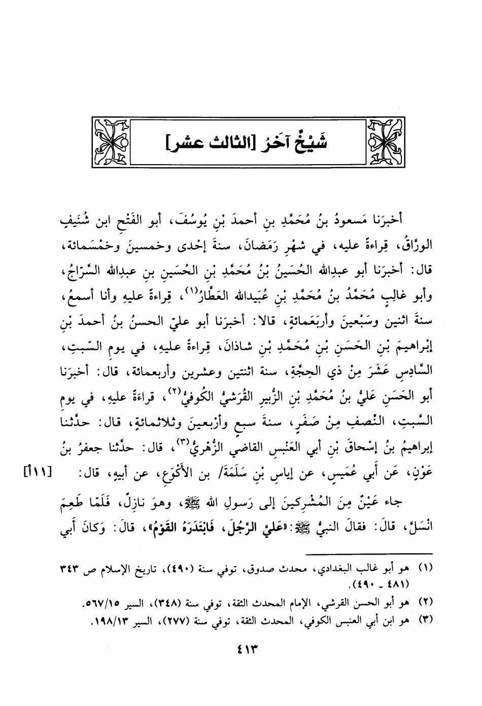 أَخْبَرَنَا مَسْعُودُ بْنُ مُحَمَّدِ بْنِ أَحْمَدَ بْنِ يُوسُفَ، أَبُو الْفَتْحِ ابن شُنَيْفٍ الْوَرَّاقُ، قِرَاءَةً عَلَيْهِ، فِي شَهْرِ رَمَضَانَ، سنة إحدى وخمسين وخمسمائة، قَالَ: أَخْبَرَنَا أَبُو عَبْدِ اللَّهِ الْحُسَيْنُ بْنُ مُحَمَّدِ بْنِ الْحُسَيْنِ بْنِ عَبْدِ اللَّهِ السَّرَّاجُ، وأبو غالب محمد بن محمد بن عبيد الله العطار، قراءةً عليه وأنا أسمع، سنة اثنين وسبعين وأربعمائة، قَالا: أَخْبَرَنَا أَبُو عَلِيٍّ الْحَسَنُ بْنُ أَحْمَدَ بْنِ إِبْرَاهِيمَ بْنِ الْحَسَنِ بْنِ مُحَمَّدِ بْنِ شَاذَانَ، قِرَاءَةً عَلَيْهِ، فِي يَوْمِ السَّبْتِ، السَّادِسَ عَشَرَ مِنْ ذِي الْحِجَّةِ، سَنَةَ اثْنَتَيْنِ وَعِشْرِينَ وأربعمائة، قَالَ: أَخْبَرَنَا أَبُو الْحَسَنِ عَلِيُّ بْنُ مُحَمَّدِ بْنِ الزُّبَيْرِ الْقُرَشِيُّ الْكُوفِيُّ، قِرَاءَةً عَلَيْهِ، فِي يَوْمِ السَّبْتِ، النِّصْفَ مِنْ صفرٍ، سَنَةَ سَبْعٍ وأربعين وثلاثمائةٍ، قَالَ: حَدَّثَنَا إِبْرَاهِيمُ بْنُ إِسْحَاقَ بْنِ أَبِي العنبس القاضي الزهري، قالا: حَدَّثَنَا جَعْفَرُ بْنُ عونٍ، عَنْ أَبِي عُمَيْسٍ، عَنْ إِيَاسِ بْنِ سَلَمَةَ بْنِ الأَكْوَعِ، عَنْ أَبِيهِ، قَالَ:
