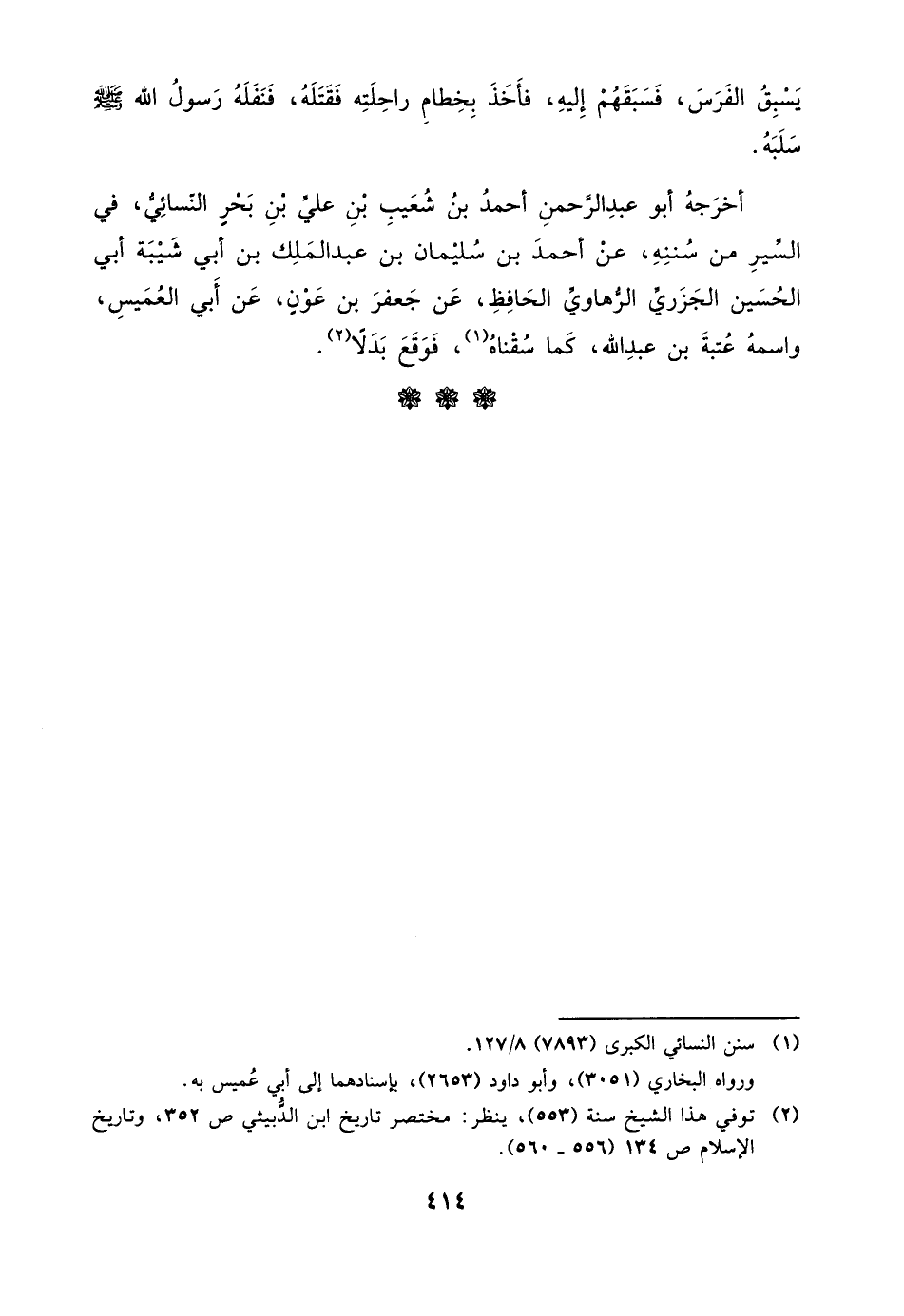 أَخْرَجَهُ أَبُو عَبْدِ الرَّحْمَنِ أَحْمَدُ بْنُ شُعَيْبِ بْنِ عَلِيِّ بْنِ بَحْرٍ النَّسَائِيُّ، فِي السَّيْرِ مِنْ سُنَنِهِ، عَنْ أَحْمَدَ بْنِ سيلمان بْنِ عَبْدِ الْمَلِكِ بْنِ أَبِي شَيْبَةَ أَبِي الْحُسَيْنِ الْجَزَرِيِّ الرُّهَاوِيِّ الْحَافِظِ، عَنْ جَعْفَرِ بْنِ عونٍ، عَنْ أَبِي الْعُمَيْسِ، وَاسْمُهُ عُتْبَةُ بْنُ عَبْدِ اللَّهِ، كَمَا سُقْنَاهُ، فَوَقَعَ بَدَلا.