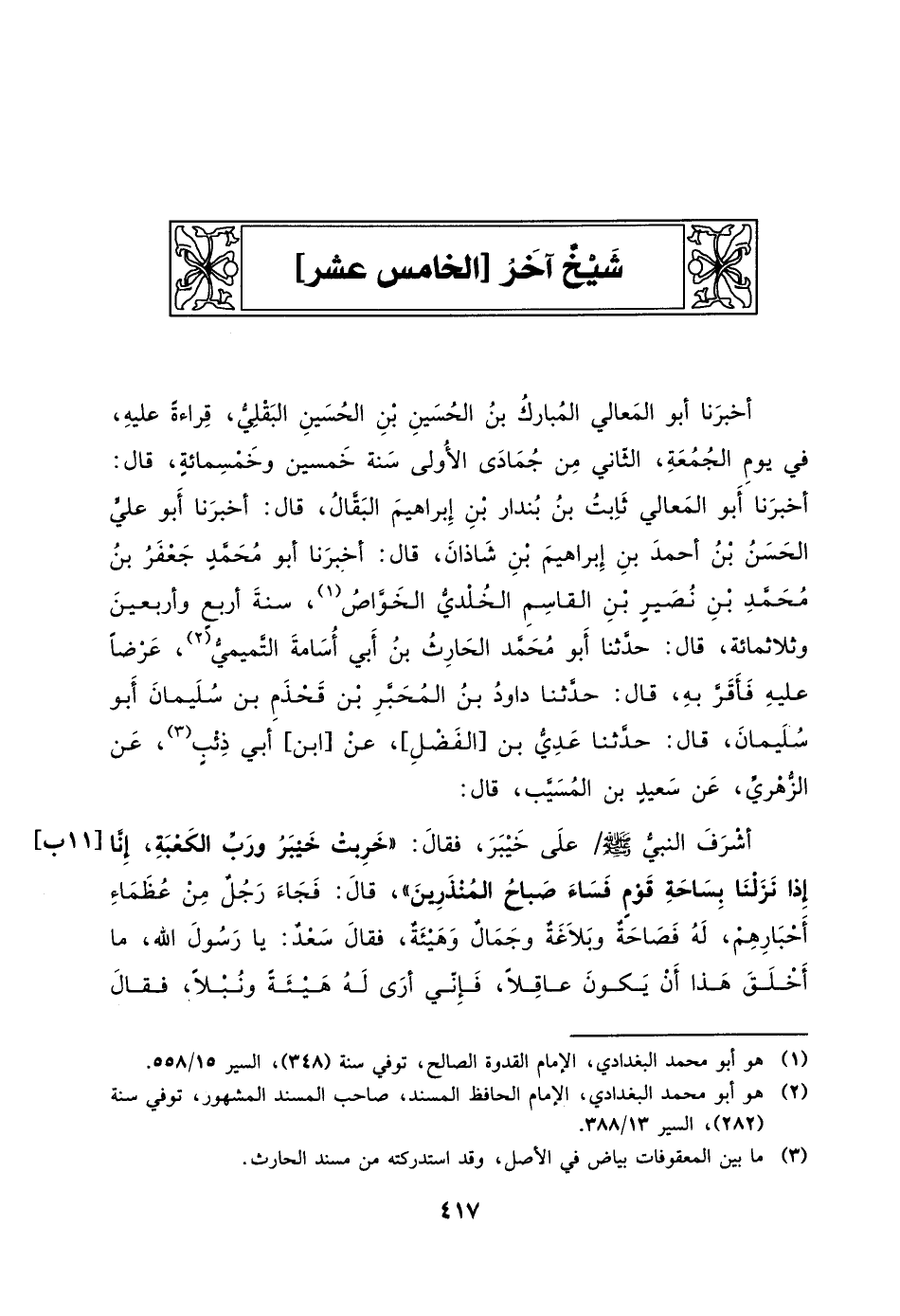 أَخْبَرَنَا أَبُو الْمَعَالِي الْمُبَارَكُ بْنُ الْحُسَيْنِ بْنِ الْحُسَيْنِ الْبَقْلِيُّ، قِرَاءَةً عَلَيْهِ، فِي يَوْمِ الْجُمُعَةِ، الثَّانِي مِنْ جُمَادَى الأولى سنة خمسين وخمسمائة، قَالَ: أَخْبَرَنَا أَبُو الْمَعَالِي ثَابِتُ بْنُ بُنْدَارِ بْنِ إِبْرَاهِيمَ الْبَقَّالُ، قَالَ: أَخْبَرَنَا أَبُو عَلِيٍّ الْحَسَنُ بْنُ أَحْمَدَ بْنِ إِبْرَاهِيمَ بْنِ شَاذَانَ، قَالَ: أَخْبَرَنَا أَبُو محمدٍ جَعْفَرُ بْنُ مُحَمَّدِ بْنِ نصيرٍ بْنِ الْقَاسِمِ الْخُلْدِيُّ الْخَوَّاصُ، سَنَةَ أربع وأربعين وثلاثمائة، قَالَ: حَدَّثَنَا أَبُو مُحَمَّدٍ الْحَارِثُ بْنُ أَبِي أُسَامَةَ التَّمِيمِيُّ، عَرْضًا عَلَيْهِ فَأَقَرَّ بِهِ، قَالَ: حَدَّثَنَا دَاوُدُ بْنُ الْمُحَبَّرِ بْنِ قَحْذَمِ بْنِ سُلَيْمَانَ أَبُو سُلَيْمَانَ، قَالَ: حَدَّثَنَا عَدِيُّ بْنُ [الْفَضْلِ] ، عَنِ [ابْنِ] أَبِي ذئبٍ، عَنِ الزُّهْرِيِّ، عَنْ سَعِيدِ بْنِ الْمُسَيِّبِ، قَالَ: