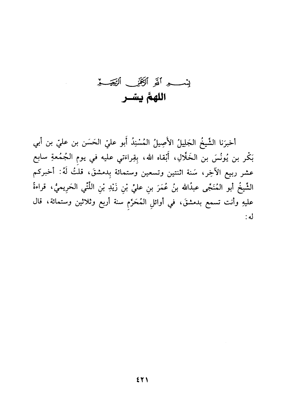أَخْبَرَنَا الشَّيْخُ الْجَلِيلُ الأَصِيلُ الْمُسْنِدُ أَبُو عَلِيٍّ الْحَسَنُ بْنُ عَلِيِّ بْنِ أَبِي بَكْرِ بْنِ يُونُسَ ابن الْخَلالِ، أَبْقَاهُ اللَّهُ، بِقِرَاءَتِي عَلَيْهِ فِي يَوْمِ الْجُمُعَةِ سَابِعَ عَشَرَ رَبِيعٍ الآخِرِ، سَنَةَ اثْنَتَيْنِ وتسعين وستمائة بِدِمَشْقَ، قُلْتُ لَهُ: أَخْبَرَكُمُ الشَّيْخُ أَبُو الْمُنَجَّى عَبْدُ اللَّهِ بْنُ عُمَرَ بْنِ عَلِيِّ بْنِ زَيْدِ بْنِ اللَّتِّيِّ الْحَرِيمِيُّ، قِرَاءَةً عَلَيْهِ وَأَنْتَ تَسْمَعُ بِدِمَشْقَ، فِي أَوَائِلِ الْمُحَرَّمِ سَنَةَ أَرْبَعٍ وثلاثين وستمائة، قال له.