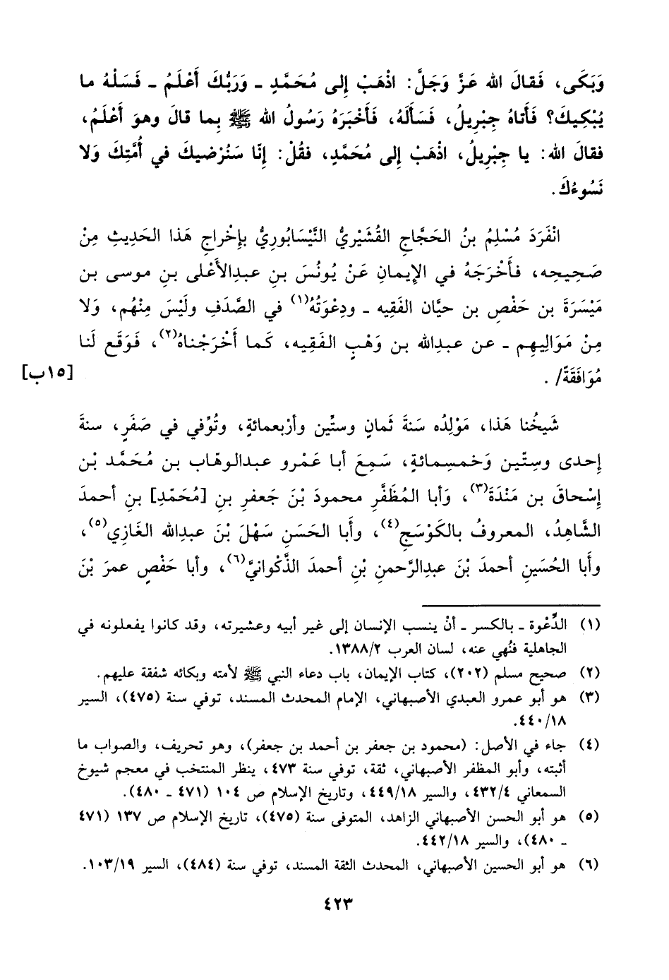 انْفَرَدَ مُسْلِمُ بْنُ الْحَجَّاجِ الْقُشَيْرِيُّ النَّيْسَابُورِيُّ بِإِخْرَاجِ هَذَا الْحَدِيثِ مِنْ صَحِيحِهِ، فَأَخْرَجَهُ فِي الإِيمَانِ عَنْ يُونُسَ بْنِ عَبْدِ الأَعْلَى بْنِ مُوسَى بْنِ مَيْسَرَةَ بْنِ حَفْصِ بْنِ حَيَّانَ الْفَقِيهِ -وَدَعْوَتُهُ في الصدف وَلَيْسَ مِنْهُمْ، وَلا مِنْ مَوَالِيهِمْ -عَنْ عَبْدِ اللَّهِ بْنِ وهبٍ الْفَقِيهِ، كَمَا أَخْرَجْنَاهُ، فَوَقَعَ لَنَا مُوَافَقَةً.