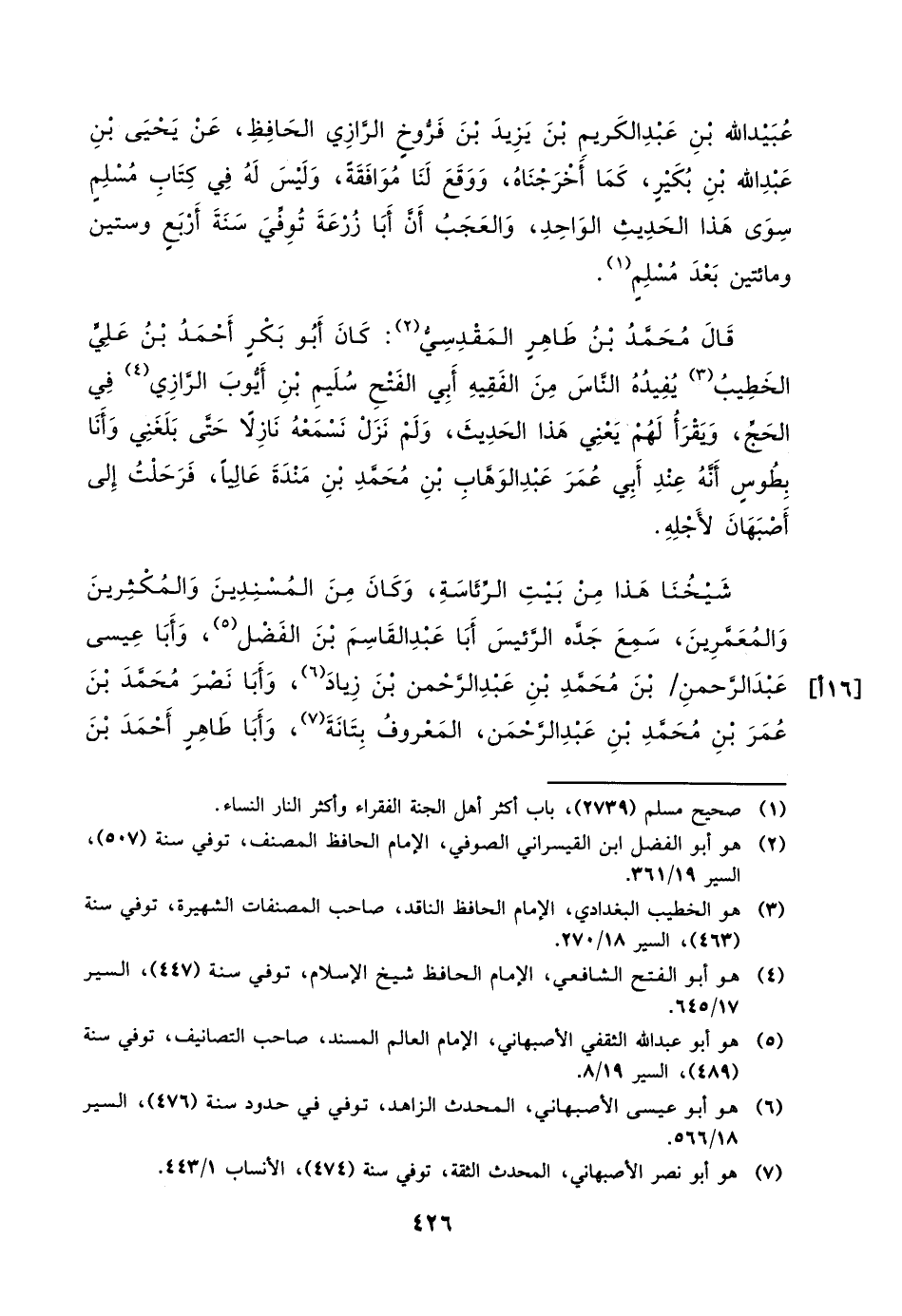 عبيد الله بْنِ عَبْدِ الْكَرِيمِ بْنِ يَزِيدَ بْنِ فروخٍ الرَّازِيِّ الْحَافِظِ، عَنْ يَحْيَى بْنِ عَبْدِ اللَّهِ بْنِ بكيرٍ، كَمَا أَخْرَجْنَاهُ، وَوَقَعَ لَنَا مُوَافَقَةً، وَلَيْسَ لَهُ فِي كِتَابِ مسلمٍ سِوَى هَذَا الْحَدِيثِ الْوَاحِدِ، وَالْعَجَبُ أَنَّ أَبَا زُرْعَةَ تُوُفِّيَ سَنَةَ أربعٍ وَسِتِّينَ وَمِائَتَيْنِ بَعْدَ مسلمٍ.