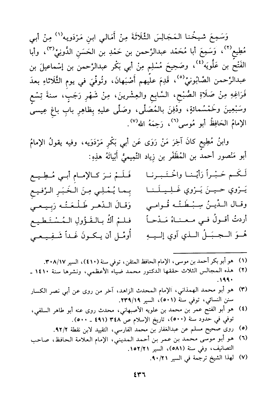 وَابْنُ مُطِيعٍ كَانَ آخِرَ مَنْ رَوَى عَنْ أَبِي بَكْرٍ مَرْدُوَيْهِ، وَفِيهِ يَقُولُ الإِمَامُ أَبُو مَنْصُورٍ أَحْمَدُ بْنُ الْمُظَفَّرِ بْنِ زِيَادٍ التَّمِيمِيُّ أبياته هذه: