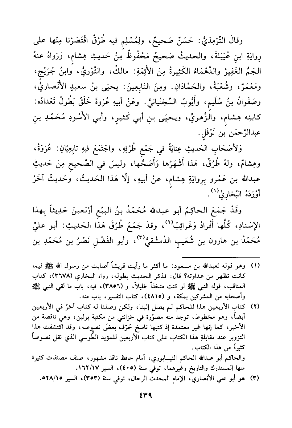 وَقَالَ التِّرْمِذِيُّ: حسنٌ صحيحٌ، ولمسلمٍ فِيهِ طرقٌ اقْتَصَرْنَا مِنْهَا عَلَى رِوَايَةِ ابْنِ عُيَيْنَةَ، وَالْحَدِيثُ صحيحٌ محفوظٌ مِنْ حَدِيثِ هشامٍ، وَرَوَاهُ عَنْهُ الْجَمُّ الْغَفِيرُ وَالدَّهْمَاءُ الْكَثِيرَةُ مِنَ الأَئِمَّةِ: مالكٌ، وَالثَّوْرِيُّ، وَابْنُ جُرَيْجٍ، ومعمرٌ، وَشُعْبَةُ، وَالْحَمَّادَانِ. وَمِنَ التَّابِعِينَ: يَحْيَى بْنُ سعيدٍ الأَنْصَارِيُّ، وَصَفْوَانُ بْنُ سليمٍ، وَأَيُّوبُ السَّخْتِيَانِيُّ. وَعَنْ أَبِيهِ عُرْوَةَ خلقٌ يَطُولُ تِعْدَادُهُ: كَابْنِهِ هِشَامٍ، وَالزُّهْرِيِّ، وَيَحْيَى بْنِ أَبِي كثيرٍ، وَأَبِي الأَسْوَدِ مُحَمَّدِ بْنِ عَبْدِ الرَّحْمَنِ بْنِ نوفلٍ.