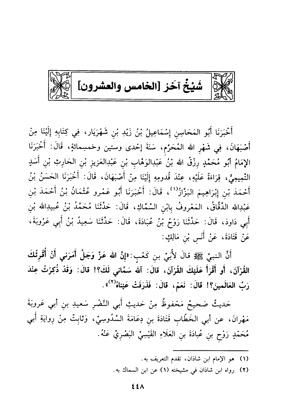 أَخْبَرَنَا أَبُو الْمَحَاسِنِ إِسْمَاعِيلُ بْنُ زَيْدِ بْنِ شَهْرِيَارَ، فِي كِتَابِهِ إِلَيْنَا مِنْ أَصْبَهَانَ، فِي شَهْرِ اللَّهِ الْمَحَرَّمِ، سنة إحدى وستين وخمسمائةٍ، قَالَ: أَخْبَرَنَا الإِمَامُ أَبُو محمدٍ رِزْقُ اللَّهِ بْنُ عَبْدِ الْوَهَّابِ بْنِ عَبْدِ الْعَزِيزِ بْنِ الْحَارِثِ بْنِ أَسَدٍ التَّمِيمِيُّ، قِرَاءَةً عَلَيْهِ، عِنْدَ قُدُومِهِ إِلَيْنَا مِنْ أَصْبَهَانَ، قَالَ: أَخْبَرَنَا الْحَسَنُ بْنُ أَحْمَدَ بْنِ إِبْرَاهِيمَ الْبَزَّازُ، قَالَ: أَخْبَرَنَا أَبُو عَمْرٍو عُثْمَانُ بْنُ أَحْمَدَ بْنِ عَبْدِ اللَّهِ الدَّقَّاقُ، الْمَعْرُوفُ بِابْنِ السَّمَّاكِ، قَالَ: حَدَّثَنَا محمد بن عبيد الله بْنِ أَبِي دَاوُدَ، قَالَ: حَدَّثَنَا رَوْحُ بْنُ عُبَادَةَ، قَالَ: حَدَّثَنَا سَعِيدُ بْنُ أَبِي عَرُوبَةَ، عَنْ قَتَادَةَ، عَنْ أَنَسِ بْنِ مالكٍ: