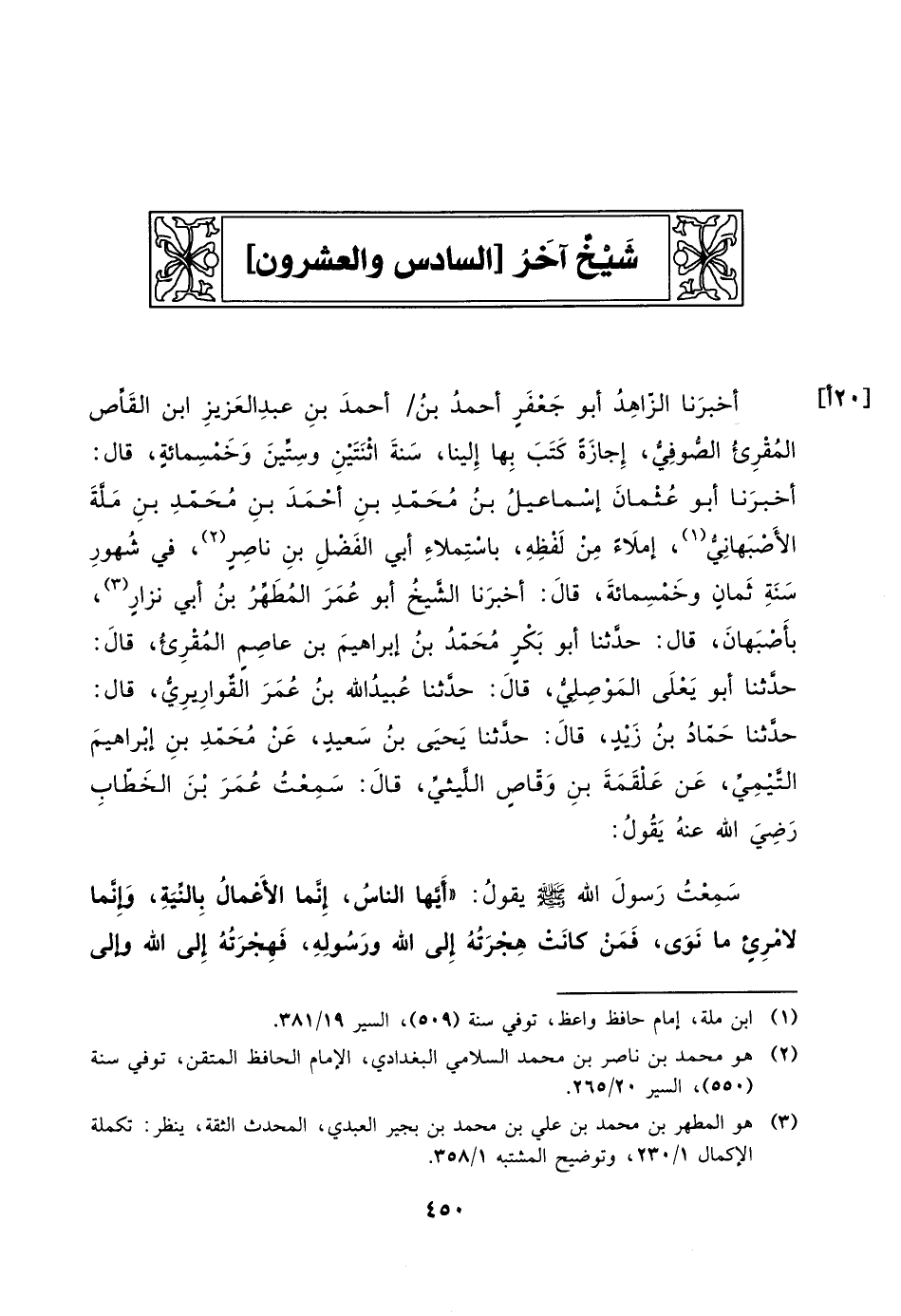 أَخْبَرَنَا الزَّاهِدُ أَبُو جعفرٍ أَحْمَدُ بْنُ أَحْمَدَ بْنِ عَبْدِ الْعَزِيزِ ابن الْقَاصِّ الْمُقْرِئُ الصُّوفِيُّ، إِجَازَةً كَتَبَ بِهَا إِلَيْنَا، سنة اثنتين وستين وخمسمائة، قَالَ: أَخْبَرَنَا أَبُو عُثْمَانَ إِسْمَاعِيلُ بْنُ مُحَمَّدِ بْنِ أَحْمَدَ بْنِ مُحَمَّدِ بْنِ مَلَّةَ الأَصْبَهَانِيُّ، إِمْلاءً مِنْ لَفْظِهِ، بِاسْتِمْلاءِ أَبِي الْفَضْلِ بْنِ ناصرٍ، في شهورٍ سنة ثمانٍ وخمسمائة، قَالَ: أَخْبَرَنَا الشَّيْخ أَبُو عُمَرَ الْمُطَهَّرُ بْنُ أَبِي نزارٍ، بِأَصْبَهَانَ، قَالَ: حَدَّثَنَا أَبُو بكرٍ مُحَمَّدُ بْنُ إِبْرَاهِيمَ بْنِ عاصمٍ الْمُقْرِئُ، قَالَ: حدثنا أبو يعلى الموصلي، قال: حدثنا عبيد الله بْنُ عُمَرَ الْقَوَارِيرِيُّ، قَالَ: حَدَّثَنَا حَمَّادُ بْنُ زيدٍ، قَالَ: حَدَّثَنَا يَحْيَى بْنُ سعيدٍ، عَنْ مُحَمَّدِ بْنِ إِبْرَاهِيمَ التَّيْمِيِّ، عَنْ عَلْقَمَةَ بْنِ وقاصٍ اللَّيْثِيِّ، قَالَ: سَمِعْتُ عُمَرَ بْنَ الْخَطَّابِ رَضِيَ اللَّهُ عَنْهُ يَقُولُ: