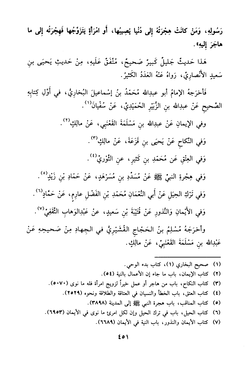 هَذَا حديثٌ جليلٌ كبيرٌ صحيحٌ، متفقٌ عَلَيْهِ، مِنْ حَدِيثِ يَحْيَى بْنِ سعيدٍ الأَنْصَارِيِّ، رَوَاهُ عَنْهُ الْعَدَدُ الْكَثِيرُ.