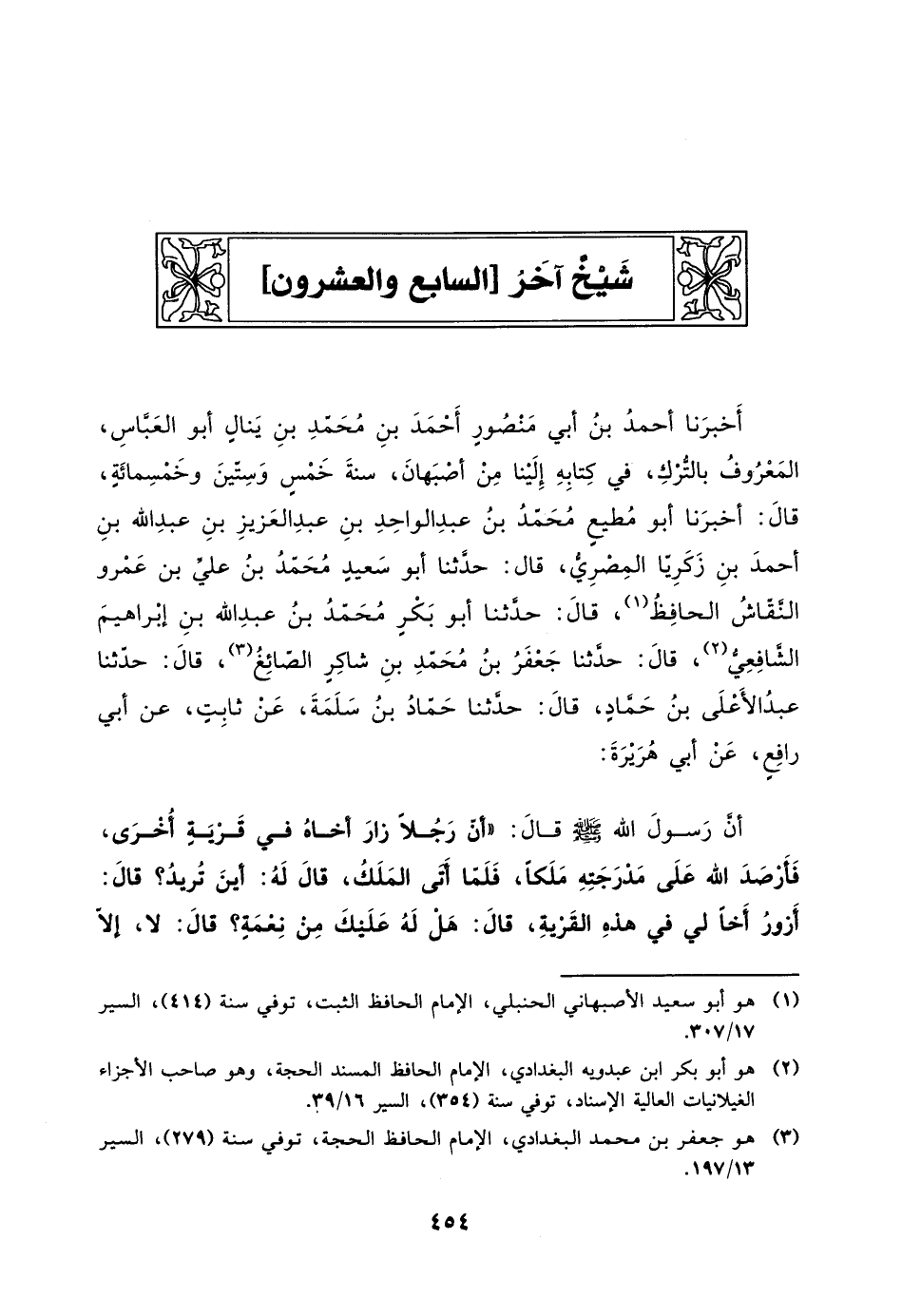 أَخْبَرَنَا أَحْمَدُ بْنُ أَبِي منصورٍ أَحْمَدَ بْنِ مُحَمَّدِ بْنِ يَنَالَ أَبُو الْعَبَّاسِ، الْمَعْرُوفُ بِالتُّرْكِ، فِي كِتَابِهِ إِلَيْنَا من أصبهان، سنة خمس وستين وخمسمائة، قَالَ: أَخْبَرَنَا أَبُو مُطِيعٍ مُحَمَّدُ بْنُ عَبْدِ الْوَاحِدِ بْنِ عَبْدِ الْعَزِيزِ بْنِ عَبْدِ اللَّهِ بْنِ أَحْمَدَ بْنِ زَكَرِيَّا الْمِصْرِيُّ، قَالَ: حَدَّثَنَا أَبُو سعيدٍ مُحَمَّدُ بْنُ عَلِيِّ بْنِ عَمْرٍو النَّقَّاشُ الْحَافِظُ، قَالَ: حَدَّثَنَا أَبُو بكرٍ مُحَمَّدُ بْنُ عَبْدِ اللَّهِ بْنِ إِبْرَاهِيمَ الشَّافِعِيُّ، قَالَ: حَدَّثَنَا جَعْفَرُ بْنُ مُحَمَّدِ بْنِ شاكرٍ الصَّائِغُ، قَالَ: حَدَّثَنَا عَبْدُ الأَعْلَى بْنُ حمادٍ، قَالَ: حَدَّثَنَا حَمَّادُ بْنُ سَلَمَةَ، عَنْ ثابتٍ، عَنْ أَبِي رافعٍ، عَنْ أَبِي هُرَيْرَةَ: