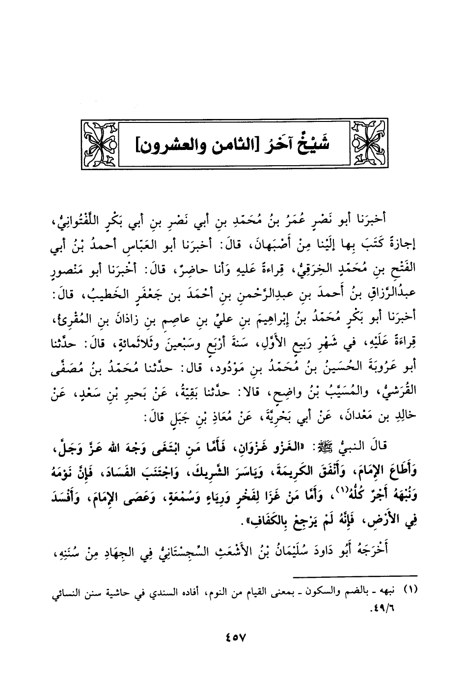 أَخْبَرَنَا أَبُو نصرٍ عُمَرُ بْنُ مُحَمَّدِ بْنِ أَبِي نَصْرِ بْنِ أَبِي بكرٍ اللَّفْتُوَانِيُّ، إِجَازَةً كَتَبَ بِهَا إِلَيْنَا مِنْ أَصْبَهَانَ، قَالَ: أَخْبَرَنَا أَبُو الْعَبَّاسِ أَحْمَدُ بْنُ أَبِي الْفَتْحِ بْنِ مُحَمَّدٍ الْخِرَقِيُّ، قِرَاءَةً عَلَيْهِ وَأَنَا حاضرٌ، قَالَ: أَخْبَرَنَا أَبُو منصورٍ عَبْدُ الرَّزَّاقِ بْنُ أَحْمَدَ بْنِ عَبْدِ الرَّحْمَنِ بْنِ أَحْمَدَ بْنِ جعفرٍ الْخَطِيبُ، قَالَ: أَخْبَرَنَا أَبُو بكرٍ مُحَمَّدُ بْنُ إِبْرَاهِيمَ بْنِ عَلِيِّ بْنِ عَاصِمِ بْنِ زَاذَانَ بْنِ الْمُقْرِئِ، قِرَاءَةً عَلَيْهِ، فِي شَهْرِ رَبِيعٍ الأَوَّلِ، سَنَةَ أربعٍ وسبعين وثلاثمائةٍ، قال: حدثنا أبو عروية الْحُسَيْنُ بْنُ مُحَمَّدِ بْنِ مَوْدُودٍ، قَالَ: حَدَّثَنَا مُحَمَّدُ بْنُ مُصَفًّى الْقُرَشِيُّ، وَالْمُسَيَّبُ بْنُ واضحٍ، قَالا: حَدَّثَنَا بَقِيَّةُ، عَنْ بَحِيرِ بْنِ سعدٍ، عَنْ خَالِدِ بْنِ مَعْدَانَ، عَنْ أَبِي بَحَرِيَّةَ، عَنْ مُعَاذِ بْنِ جبلٍ قَالَ: