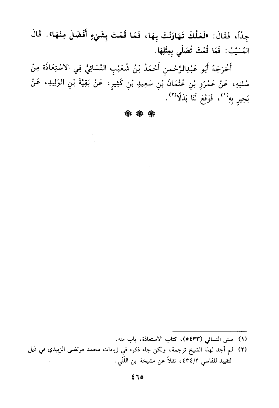 أَخْرَجَهُ أَبُو عَبْدِ الرَّحْمَنِ أَحْمَدُ بْنُ شعيبٍ النَّسَائِيُّ فِي الاسْتِعَاذَةِ مِنْ سُنَنِهِ، عَنْ عَمْرِو بْنِ عُثْمَانَ بْنِ سَعِيدِ بْنِ كثيرٍ، عَنْ بَقِيَّةَ بْنِ الْوَلِيدِ، عَنْ بحيرٍ بِهِ، فَوَقَعَ لَنَا بَدَلا.