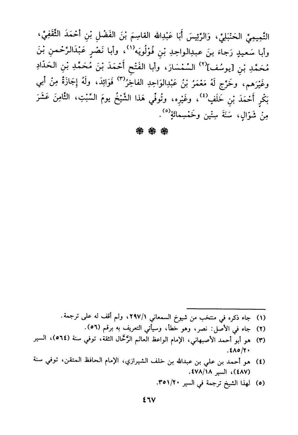 التَّمِيمِيَّ الْحَنْبَلِيَّ، وَالرَّئِيسَ أَبَا عَبْدِ اللَّهِ الْقَاسِمَ بْنَ الْفَضْلِ بْنِ أَحْمَدَ الثَّقَفِيَّ، وَأَبَا سَعِيدٍ رجاء بن عبد الواحد بن فولويه، وَأَبَا نَصْرٍ عَبْدَ الرَّحْمَنِ بْنَ مُحَمَّدِ بْنِ [يُوسُفَ] السِّمْسَارَ، وَأَبَا الْفَتْحِ أَحْمَدَ بْنَ مُحَمَّدِ بْنِ الْحَدَّادِ وَغَيْرَهُمْ، وَخَرَّجَ لَهُ مَعْمَرُ بْنُ عَبْدِ الْوَاحِدِ الْفَاخِرُ فَوَائِدَ، وَلَهُ إجازةٌ مِنْ أَبِي بكرٍ أَحْمَدَ بْنِ خلفٍ، وَغَيْرِهِ، وَتُوُفِّيَ هَذَا الشَّيْخُ يَوْمَ السَّبْتِ، الثَّامِنَ عَشَرَ مِنْ شوالٍ، سنة ستين وخمسمائة.