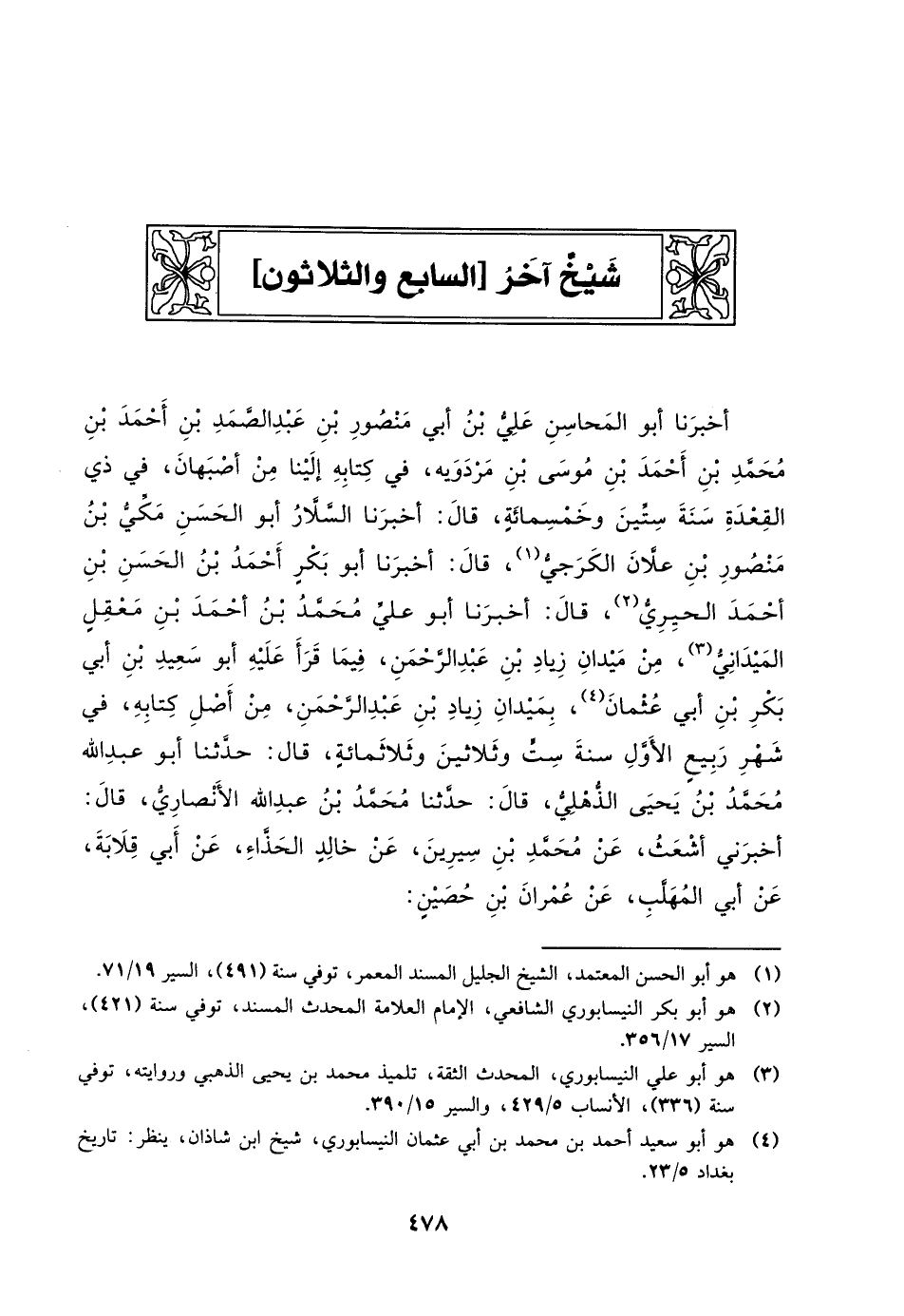 أَخْبَرَنَا أَبُو الْمَحَاسِنِ عَلِيُّ بْنُ أَبِي مَنْصُورِ بْنِ عَبْدِ الصَّمَدِ بْنُ أَحْمَدَ بْنِ مُحَمَّدِ بْنِ أَحْمَدَ بْنِ مُوسَى بْنِ مَرْدُوَيْهِ، فِي كِتَابِهِ إِلَيْنَا مِنْ أصبهان، في ذي القعدة سنة ستين وخمسمائة، قَالَ: أَخْبَرَنَا السَّلارُ أَبُو الْحَسَنِ مَكِّيُّ بْنُ مَنْصُورِ بْنِ عَلانَ الْكَرْجِيُّ، قَالَ: أَخْبَرَنَا أَبُو بكرٍ أَحْمَدُ بْنُ الْحَسَنِ بْنِ أَحْمَدَ الْحِيرِيُّ، قَالَ: أَخْبَرَنَا أَبُو عَلِيٍّ مُحَمَّدُ بْنُ أَحْمَدَ بْنِ معقلٍ الْمَيْدَانِيُّ، مِنْ مَيْدَانِ زِيَادِ بْنِ عَبْدِ الرَّحْمَنِ، فِيمَا قَرَأَ عَلَيْهِ أَبُو سَعِيدِ بْنُ أَبِي بَكْرِ بْنِ أَبِي عُثْمَانَ، بِمَيْدَانِ زِيَادِ بْنِ عَبْدِ الرَّحْمَنِ، مِنْ أَصْلِ كِتَابِهِ، فِي شَهْرِ رَبِيعٍ الأَوَّلِ سَنَةَ سِتٍّ وَثَلاثِينَ وثلاثمائة، قَالَ: حَدَّثَنَا أَبُو عَبْدِ اللَّهِ مُحَمَّدُ بْنُ يَحْيَى الذُّهْلِيُّ، قَالَ: حَدَّثَنَا مُحَمَّدُ بْنُ عَبْدِ اللَّهِ الأَنْصَارِيُّ، قَالَ: أَخْبَرَنِي أَشْعَثُ، عَنْ مُحَمَّدِ بْنِ سِيرِينَ، عَنْ خَالِدٍ الْحَذَّاءِ، عَن أَبِي قِلابَةَ، عَنْ أَبِي الْمُهَلَّبِ، عَنْ عِمْرَانَ بْنِ حصينٍ: