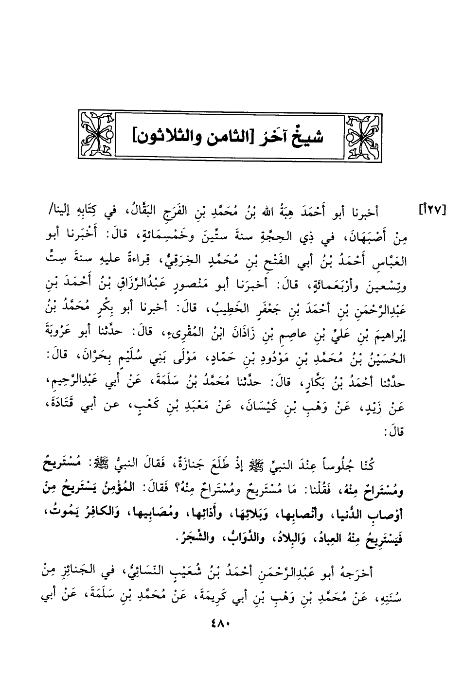 أَخْبَرَنَا أَبُو أَحْمَدَ هِبَةُ اللَّهِ بْنُ مُحَمَّدِ بْنِ الْفَرَجِ الْبَقَّالُ، فِي كِتَابِهِ إِلَيْنَا مِنْ أَصْبَهَانَ، فِي ذِي الحجة سنة ستبن وخمسمائةٍ، قَالَ: أَخْبَرَنَا أَبُو الْعَبَّاسِ أَحْمَدُ بْنُ أَبِي الْفَتْحِ بْنِ محمدٍ الْخِرَقِيُّ، قِرَاءَةً عَلَيْهِ سَنَةَ ست وتسعين وأربعمائةٍ، قَالَ: أَخْبَرَنَا أَبُو منصورٍ عَبْدُ الرَّزَّاقِ بْنُ أَحْمَدَ بْنِ عَبْدِ الرَّحْمَنِ بْنِ أَحْمَدَ بْنِ جعفرٍ الْخَطِيبُ، قَالَ: أَخْبَرَنَا أَبُو بكرٍ مُحَمَّدُ بْنُ إِبْرَاهِيمَ بْنِ عَلِيِّ بْنِ عَاصِمِ بْنِ زاذان ابن الْمُقْرِئِ، قَالَ: حَدَّثَنَا أَبُو عَرُوبَةَ الْحُسَيْنُ بْنُ مُحَمَّدِ بْنِ مَوْدُودِ بْنِ حمادٍ، مَوْلَى بَنِي سُلَيْمٍ بِحَرَّانَ، قَالَ: حَدَّثَنَا أَحْمَدُ بْنُ بكارٍ، قَالَ: حَدَّثَنَا مُحَمَّدُ بْنُ سَلَمَةَ، عَنْ أَبِي عَبْدِ الرَّحِيمِ، عَنْ زيدٍ، عَنْ وَهْبِ بْنِ كَيْسَانَ، عَنْ مَعْبَدِ بْنِ كعبٍ، عَنْ أَبِي قَتَادَةَ، قَالَ: