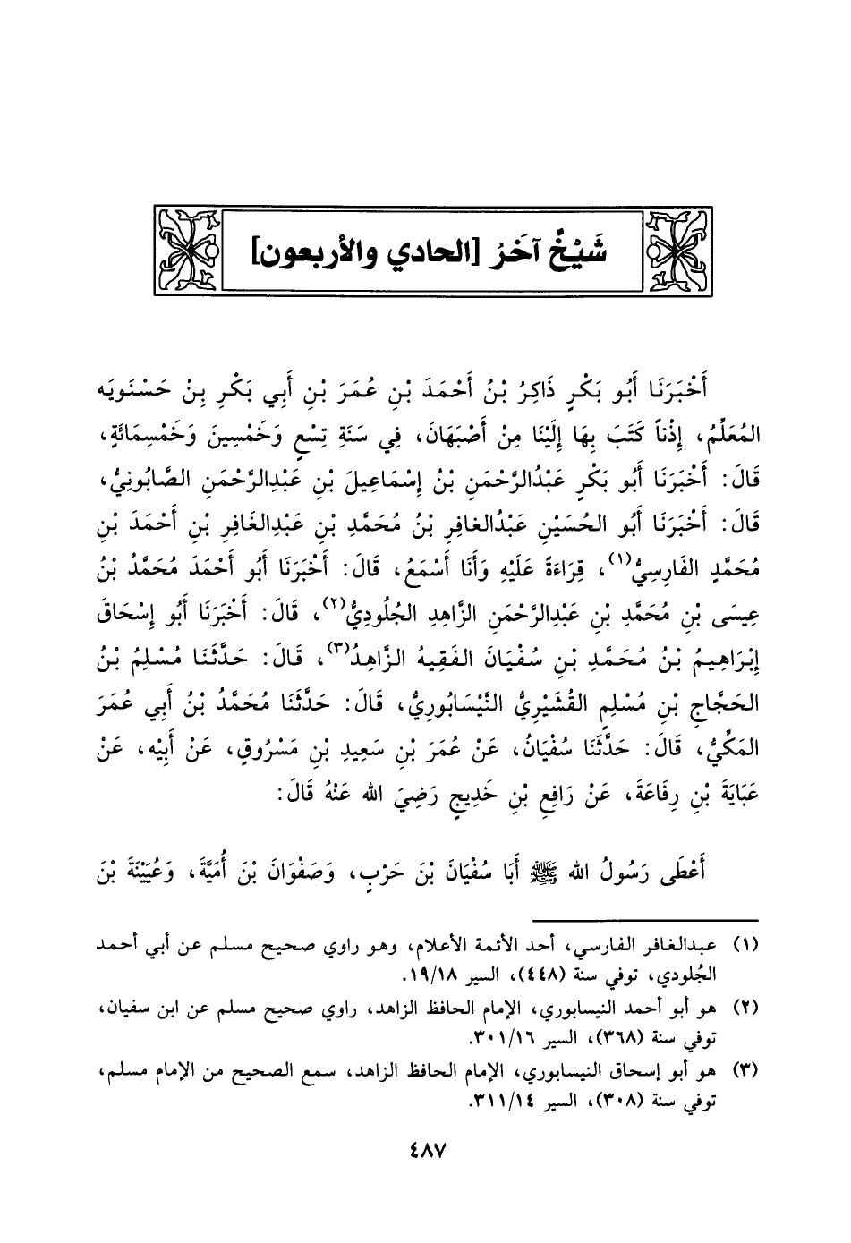 أَخْبَرَنَا أَبُو بكرٍ ذَاكِرُ بْنُ أَحْمَدَ بْنِ عُمَرَ بْنِ أَبِي بَكْرِ بْنِ حَسْنُوَيْهِ الْمُعَلِّمُ، إِذْنًا كَتَبَ بِهَا إِلَيْنَا مِنْ أَصْبَهَانَ، فِي سَنَةِ تسعٍ وَخَمْسِينَ وخمسمائةٍ، قَالَ: أَخْبَرَنَا أَبُو بكرٍ عَبْدُ الرَّحْمَنِ بْنُ إِسْمَاعِيلَ بْنِ عَبْدِ الرَّحْمَنِ الصَّابُونِيُّ، قَالَ: أَخْبَرَنَا أَبُو الْحُسَيْنِ عَبْدُ الْغَافِرِ بْنُ مُحَمَّدِ بْنِ عَبْدِ الْغَافِرِ بْنِ أَحْمَدَ بْنِ محمدٍ الْفَارِسِيُّ، قِرَاءَةً عَلَيْهِ وَأَنَا أَسْمَعُ، قَالَ: أَخْبَرَنَا أَبُو أَحْمَدَ مُحَمَّدُ بْنُ عِيسَى بْنِ مُحَمَّدِ بْنِ عَبْدِ الرَّحْمَنِ الزَّاهِدُ الْجُلُودِيُّ، قَالَ: أَخْبَرَنَا أَبُو إِسْحَاقَ إِبْرَاهِيمُ بْنُ مُحَمَّدِ بْنِ سُفْيَانَ الْفَقِيهُ الزَّاهِدُ، قَالَ: حَدَّثَنَا مُسْلِمُ بْنُ الْحَجَّاجِ بْنِ مُسْلِمٍ الْقُشَيْرِيُّ النَّيْسَابُورِيُّ، قَالَ: حَدَّثَنَا مُحَمَّدُ بْنُ أَبِي عُمَرَ الْمَكِّيُّ، قَالَ: حَدَّثَنَا سُفْيَانُ، عَنْ عُمَرَ بْنِ سَعِيدِ بْنِ مسروقٍ، عَنْ أَبِيهِ، عَنْ عَبَايَةَ بْنِ رِفَاعَةَ، عَنْ رَافِعِ بْنِ خديجٍ رَضِيَ اللَّهُ عَنْهُ قَالَ: