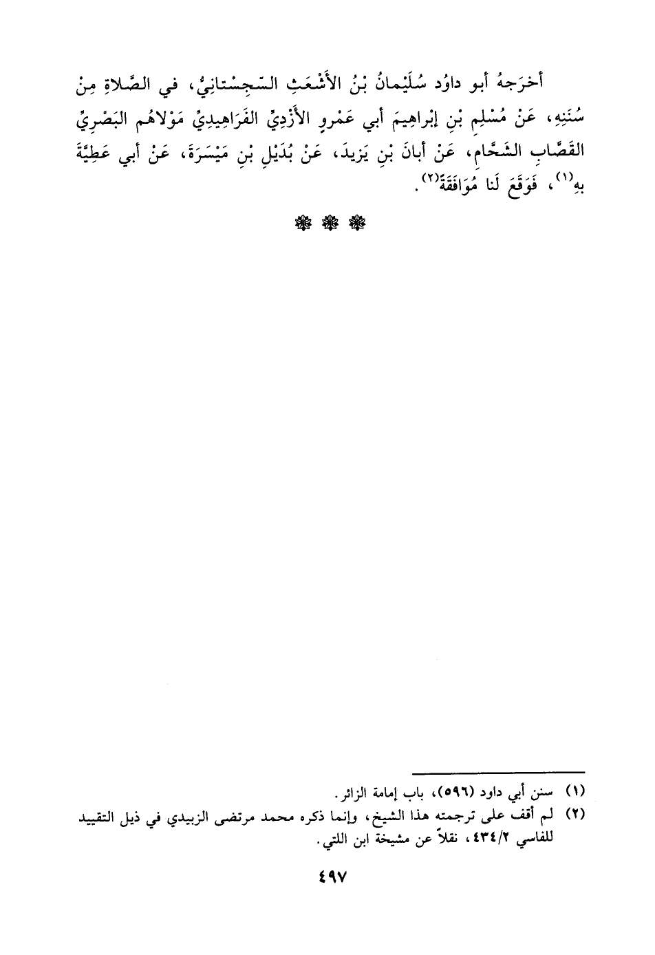 أَخْرَجَهُ أَبُو دَاوُدَ سُلَيْمَانُ بْنُ الأَشْعَثِ السِّجِسْتَانِيُّ، فِي الصَّلاةِ مِنْ سُنَنِهِ، عَنْ مُسْلِمِ بْنِ إِبْرَاهِيمَ أَبِي عمروٍ الأَزْدِيِّ الْفَرَاهِيدِيِّ مَوْلاهُمُ الْبَصْرِيِّ الْقَصَّابِ الشَّحَّامِ، عَنْ أَبَانِ بْنِ يَزِيدَ، عَنْ بُدَيْلِ بْنِ مَيْسَرَةَ، عَنْ أَبِي عَطِيَّةَ بِهِ، فَوَقَعَ لَنَا مُوَافَقَةً.