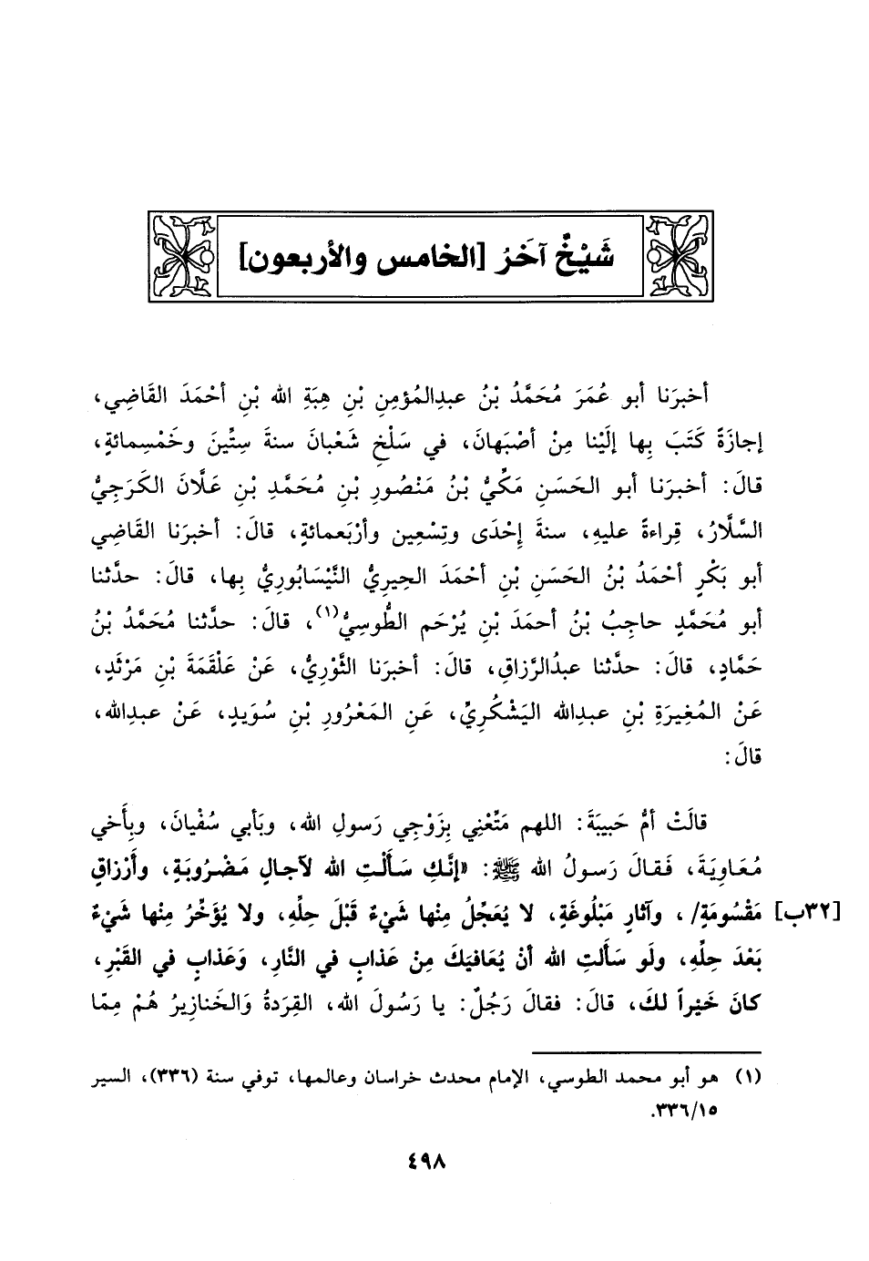 أَخْبَرَنَا أَبُو عُمَرَ مُحَمَّدُ بْنُ عَبْدِ الْمُؤْمِنِ بْنِ هِبَةِ اللَّهِ بْنِ أَحْمَدَ الْقَاضِي، إِجَازَةً كَتَبَ بِهَا إِلَيْنَا مِنْ أَصْبَهَانَ، فِي سَلْخِ شَعْبَانَ سَنَةَ سِتِّينَ وخمسمائةٍ، قَالَ: أَخْبَرَنَا أَبُو الْحَسَنِ مَكِّيُّ بْنُ مَنْصُورِ بْنِ مُحَمَّدِ بْنِ عَلانَ الْكَرْجِيُّ السَّلارُ، قِرَاءَةً عليه، سنة إحدى وتسعين وأربعمائةٍ، قَالَ: أَخْبَرَنَا الْقَاضِي أَبُو بكرٍ أَحْمَدُ بْنُ الْحَسَنِ بْنِ أَحْمَدَ الْحِيرِيُّ النَّيْسَابُورِيُّ بِهَا، قَالَ: حَدَّثَنَا أَبُو محمدٍ حَاجِبُ بْنُ أَحْمَدَ بْنِ يَرْحَمَ الطُّوسِيُّ، قَالَ: حَدَّثَنَا مُحَمَّدُ بْنُ حمادٍ، قَالَ: حَدَّثَنَا عَبْدُ الرَّزَّاقِ، قَالَ: أَخْبَرَنَا الثَّوْرِيُّ، عَنْ عَلْقَمَةَ بْنِ مرثدٍ، عَنِ الْمُغِيرَةِ بْنِ عَبْدِ اللَّهِ الْيَشْكُرِيِّ، عَنِ الْمَعْرُورِ بْنِ سويدٍ، عَنْ عَبْدِ اللَّهِ، قَالَ: