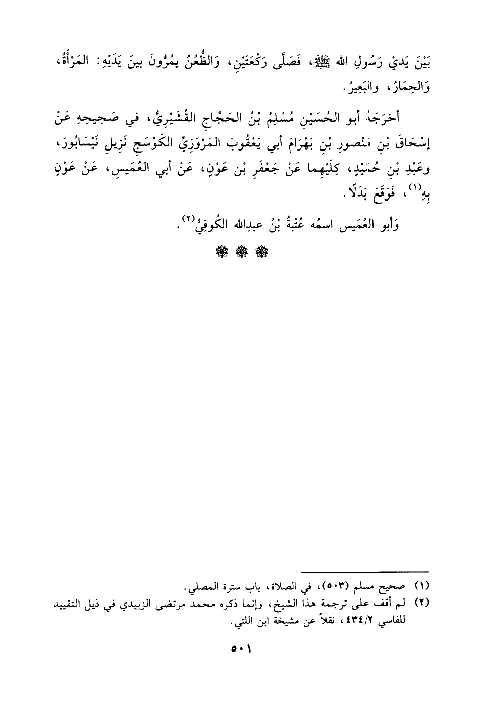 أَخْرَجَهُ أَبُو الْحُسَيْنِ مُسْلِمُ بْنُ الْحَجَّاجِ الْقُشَيْرِيُّ، فِي صَحِيحِهِ عَنْ إِسْحَاقَ بْنِ مَنْصُورِ بْنِ بَهْرَامَ أَبِي يَعْقُوبَ الْمَرْوَزِيِّ الْكَوْسَجِ نَزِيلِ نَيْسَابُورَ، وَعَبْدِ بْنِ حميدٍ، كِلَيْهِمَا عَنْ جَعْفَرِ بْنِ عونٍ، عَنْ أَبِي الْعُمَيْسِ، عَنْ عونٍ بِهِ، فَوَقَعَ بَدَلا.