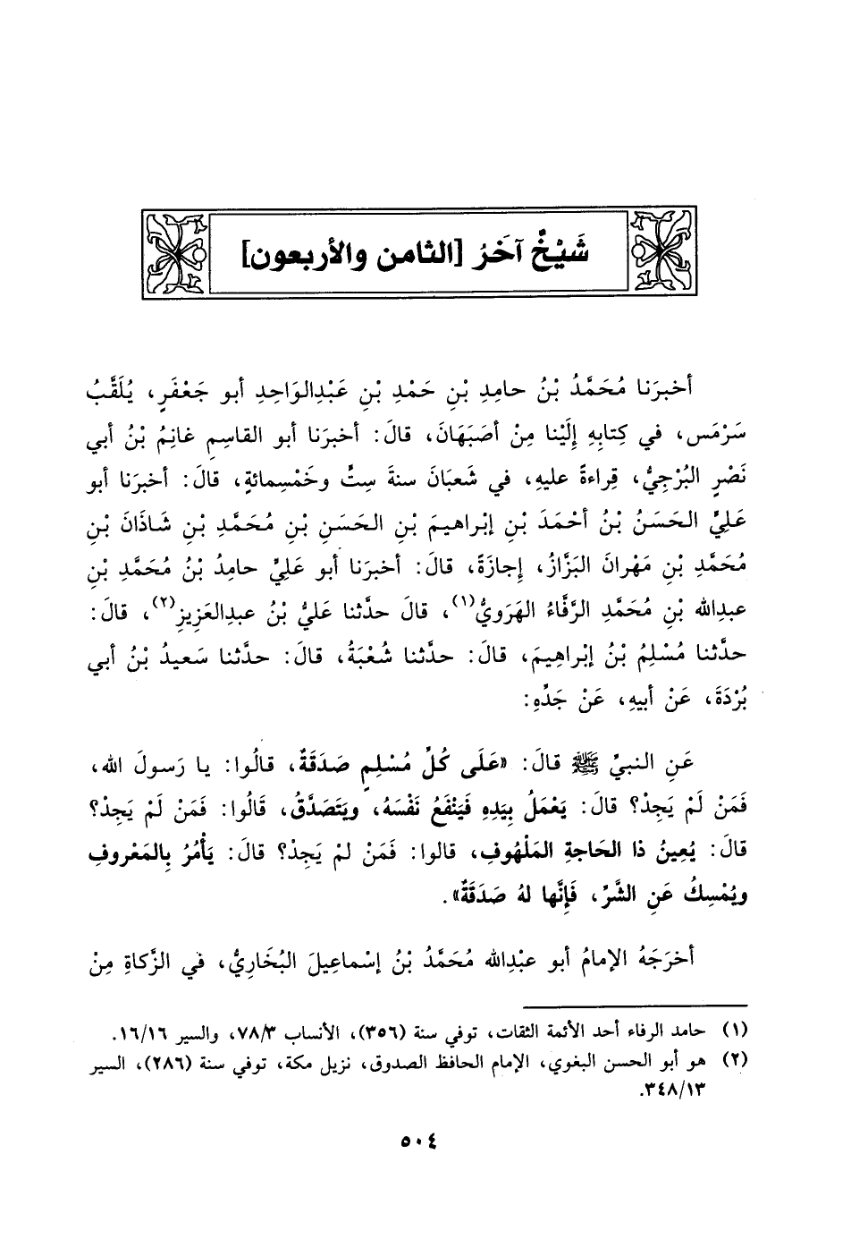 أَخْبَرَنَا مُحَمَّدُ بْنُ حَامِدِ بْنِ حَمْدِ بْنِ عَبْدِ الْوَاحِدِ أَبُو جَعْفَرٍ، يُلَقَّبُ سرمس، فِي كِتَابِهِ إِلَيْنَا مِنْ أَصْبَهَانَ، قَالَ: أَخْبَرَنَا أَبُو الْقَاسِمِ غَانِمُ بْنُ أَبِي نصرٍ الْبُرْجِيُّ، قِرَاءَةً عَلَيْهِ، فِي شَعْبَانَ سنة ست وخمسمائةٍ، قَالَ: أَخْبَرَنَا أَبُو عَلِيٍّ الْحَسَنُ بْنُ أَحْمَدَ بْنِ إِبْرَاهِيمَ بْنِ الْحَسَنِ بْنِ مُحَمَّدِ بْنِ شَاذَانَ بْنِ مُحَمَّدِ بْنِ مِهْرَانَ الْبَزَّازُ، إِجَازَةً، قَالَ: أَخْبَرَنَا أَبُو عَلِيٍّ حَامِدُ بْنُ مُحَمَّدِ بْنِ عَبْدِ اللَّهِ بْنِ مُحَمَّدٍ الرَّفَّاءُ الْهَرَوِيُّ، قَالَ حَدَّثَنَا عَلِيُّ بْنُ عَبْدِ الْعَزِيزِ، قَالَ: حَدَّثَنَا مُسْلِمُ بْنُ إِبْرَاهِيمَ، قَالَ: حَدَّثَنَا شُعْبَةُ، قَالَ: حَدَّثَنَا سَعِيدُ بْنُ أَبِي بُرْدَةَ، عَنْ أَبِيهِ، عَنْ جَدِّهِ: