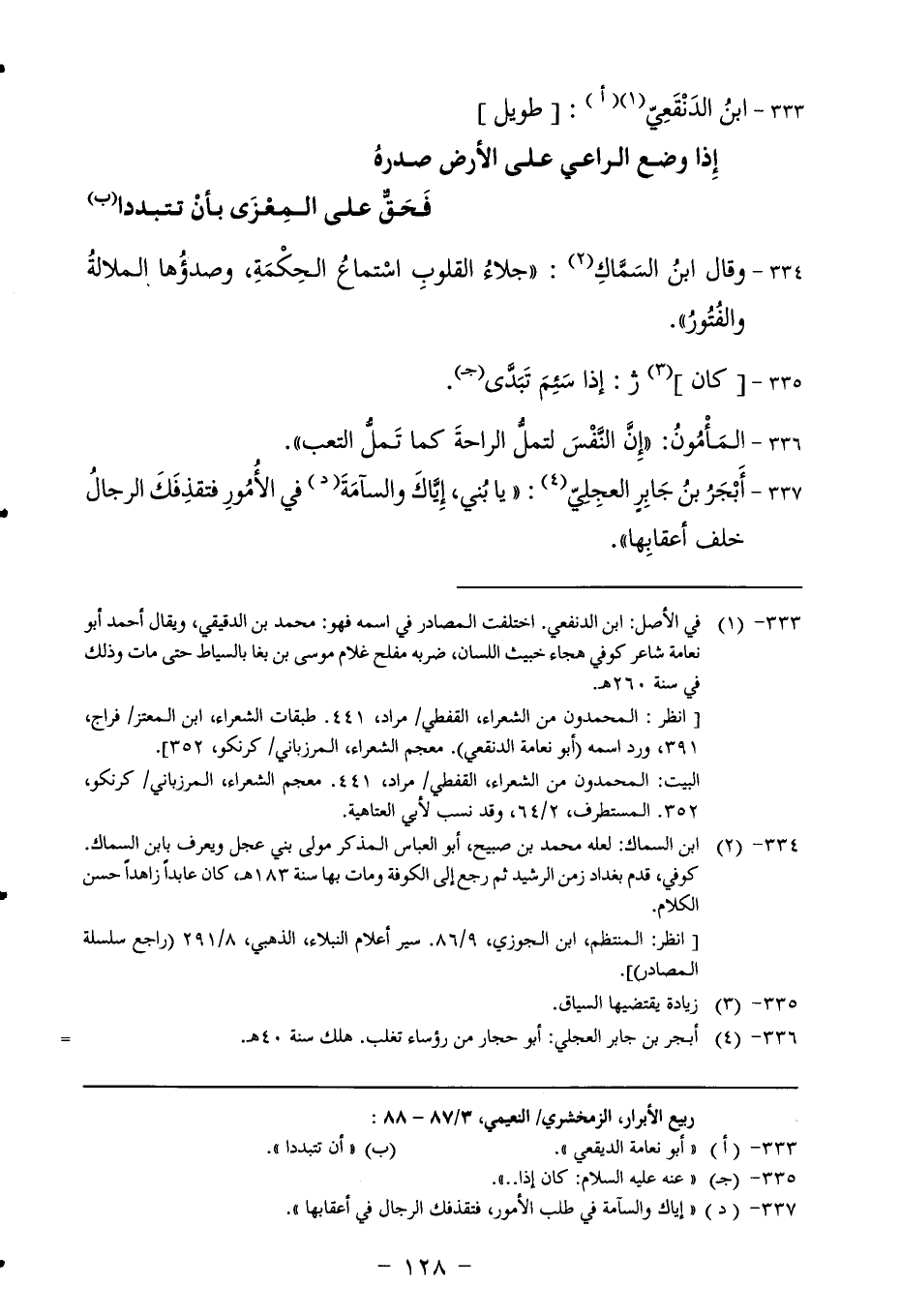 فنذرت أن أحتال لقائلها حتى أجمع بينه وبين من يهوى، فإني لبالمزدلفة إذا سمعت من ينشدها فأدنيته فزعم أنه قائلهما في بنت عم له، وقد نذر أهلها لا يزوجوه بها. فوجهت إلى الحي وما زلت أبذل لهم حتى زوجوه، وإذا المرأة أعشق من الرجل. وكانت زبيدة تعدها من أعظم حسناتها وتقول: ما أنا بشيء أسر بجمعي بين ذلك الفتى والفتاة.