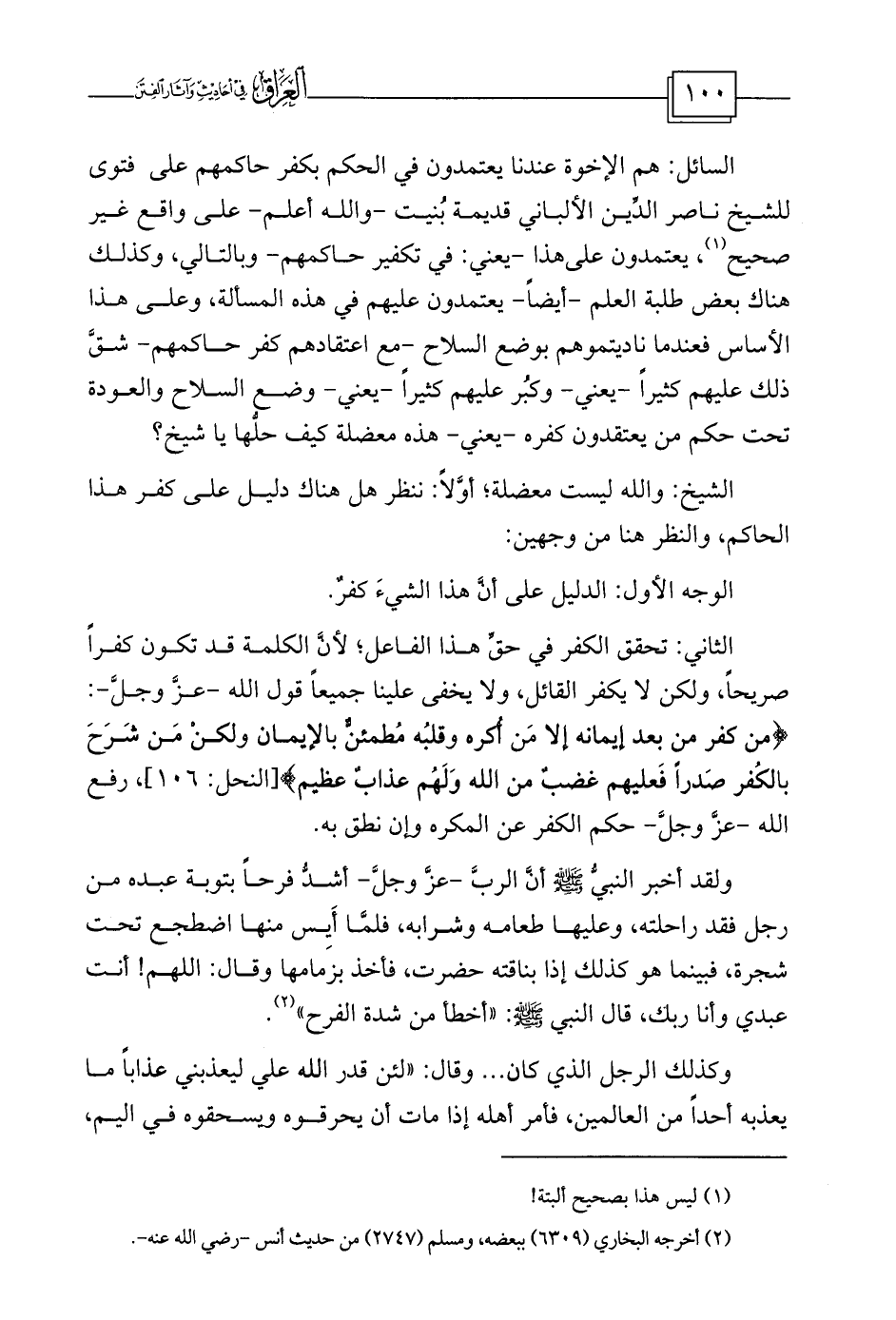 السائل: هم الإخوة عندنا يعتمدون في الحكم بكفر حاكمهم على فتوى للشيخ ناصر الدِّين الألباني قديمة بُنيت -والله أعلم- على واقع غير صحيح (¬1) ، يعتمدون علىهذا -يعني: في تكفير حاكمهم- وبالتالي، وكذلك هناك بعض طلبة العلم -أيضاً- يعتمدون عليهم في هذه المسألة، وعلى هذا الأساس فعندما ناديتموهم بوضع السلاح -مع اعتقادهم كفر حاكمهم- شقَّ ذلك عليهم كثيراً -يعني- وكبُر عليهم كثيراً -يعني- وضع السلاح والعودة تحت حكم من يعتقدون كفره -يعني- هذه معضلة كيف حلُّها يا شيخ؟